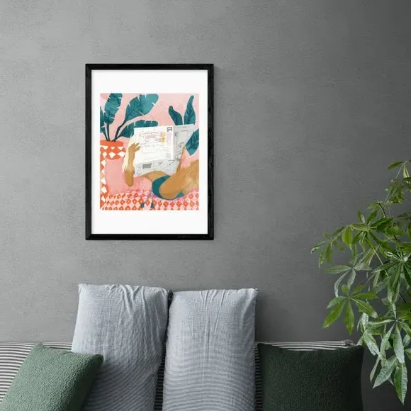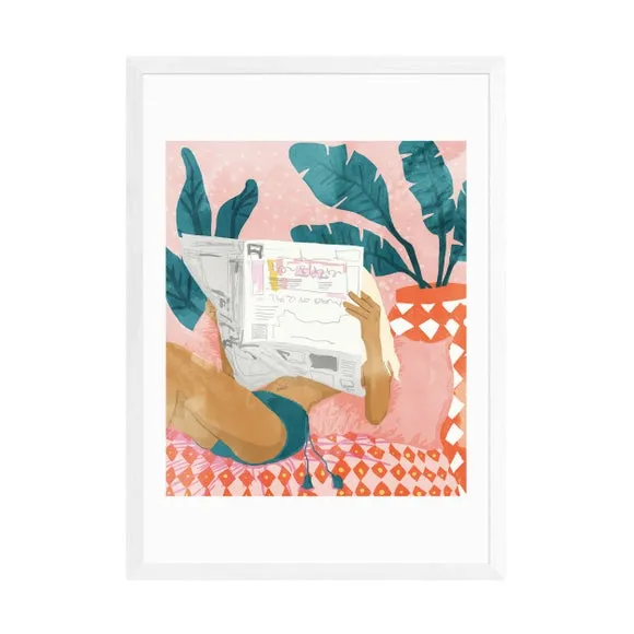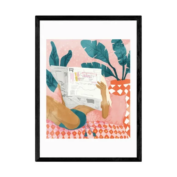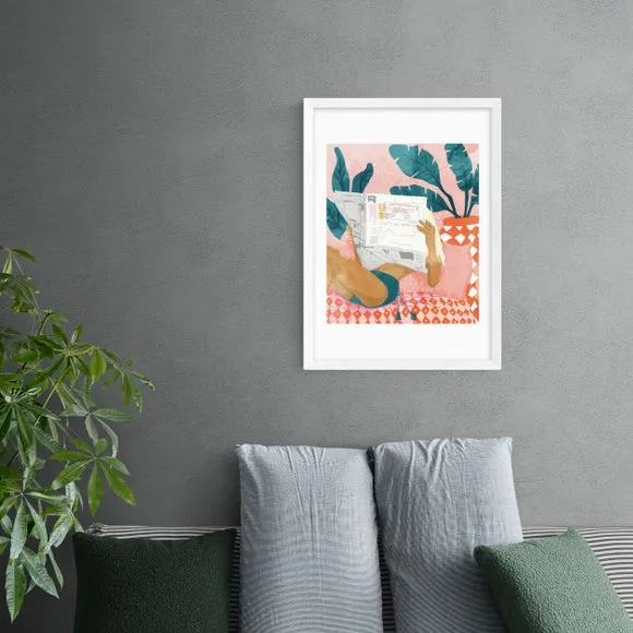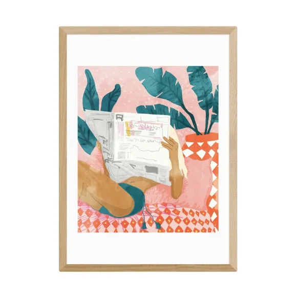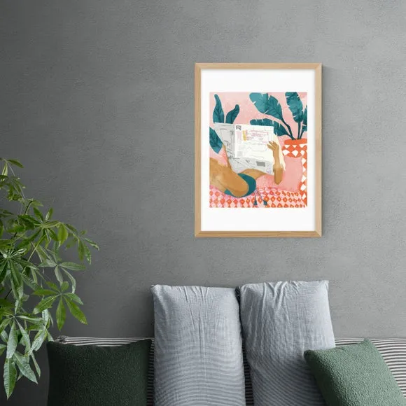 The Morning News Print features figurative artwork with vibrant multicolor tones, printed on 210gsm acid-free archival paper. Its giclee printing process ensures lasting color vibrancy, while the archival-quality paper provides durability and fade resistance. The print offers flexible display options with multiple size choices and optional framing in black, white, or oak effect finishes.