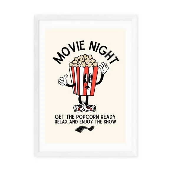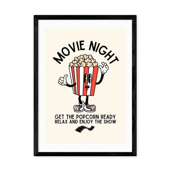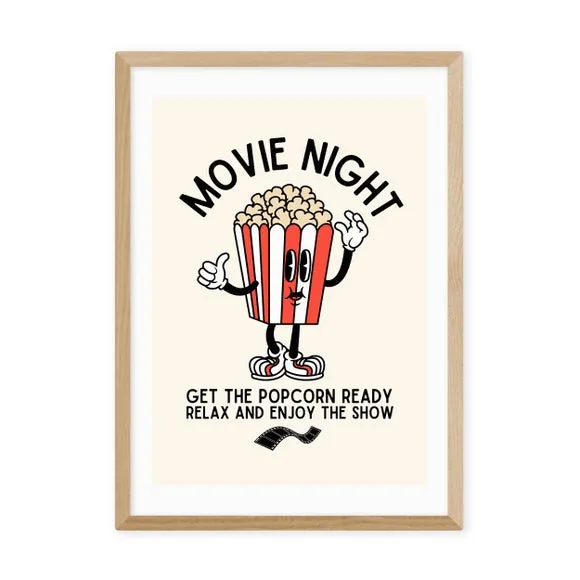 The Movie Night Popcorn Wall Print offers vintage-inspired charm with its retro popcorn design. Featuring Giclee printing technology on 210gsm acid-free archival paper, the artwork provides fade resistance lasting up to 70 years. The print includes a digital white border and comes with customizable frame options in black, white, or oak effect Obeche wood. Available in multiple sizes from A4 to A1, this artwork suits various wall spaces while maintaining crisp detail and vibrant colors.