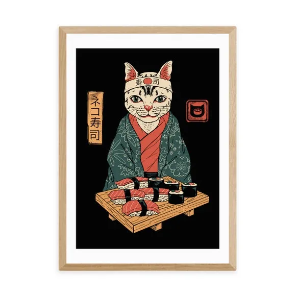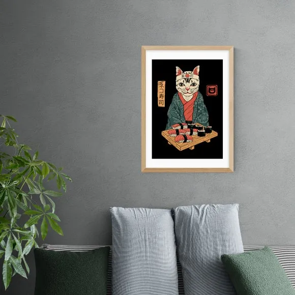 The Neko Sushi Bar Print features charming animal-style artwork with vibrant multicolor design. Printed on 210gsm acid-free archival paper, the giclee printing process ensures long-lasting color vibrancy and quality. Available in multiple sizes from A4 to A1, with optional black, white, or oak effect frames. The archival paper construction provides durability while maintaining crisp detail reproduction.