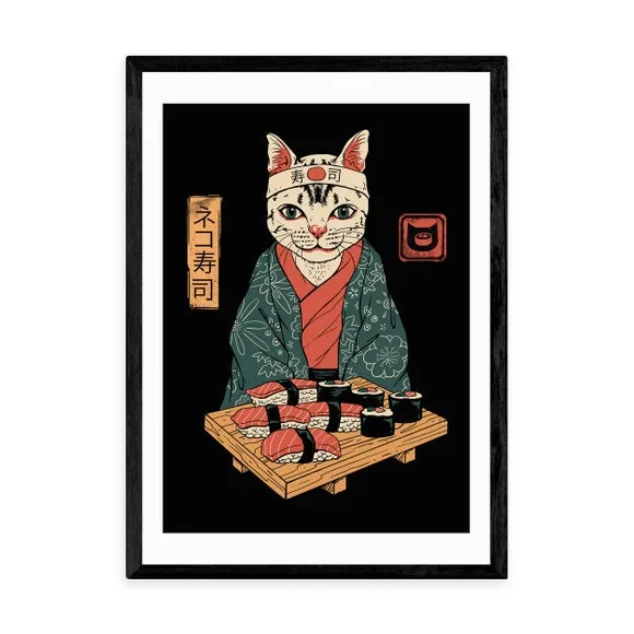 * Artwork by Vincent Trinidad* Animals style* Printed on 210gsm acid-free archival paper* Available in A1, A2, A3 & A4 sizes* Frames available: black, white and oak effect* You can buy the print unframed too! Do you know a sushi lover? Or are one yourself? This print is perfect to hang in your kitchen for a lovely home refresh! You are able to customise the size and frame for this print! Choose from a variety of frame options and then pick your size. This way you can find the best design to suit your home interior. Each piece of artwork has gone through a giclee printing process which will help the print stay vibrant for years to come to keep your home looking fresh.