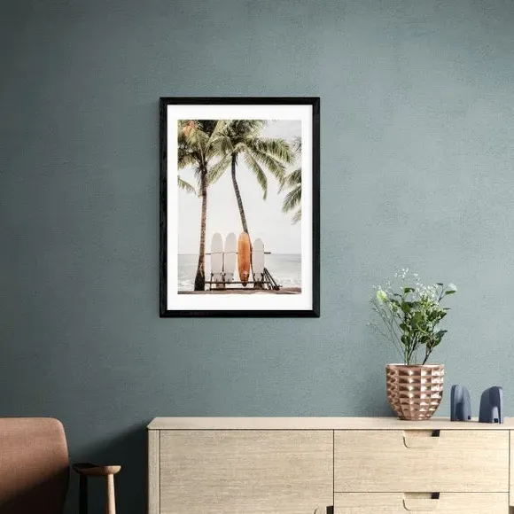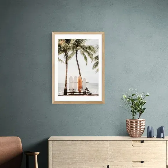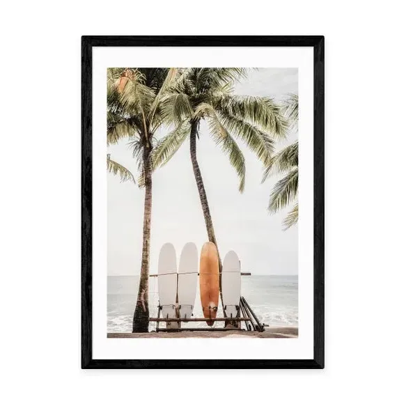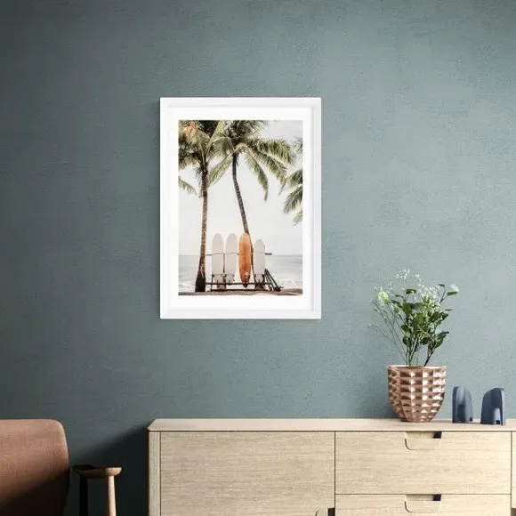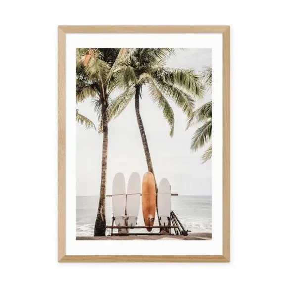 * Artwork by Sisi and Seb* Available in A1, A2, A3 & A4 sizes* Obeche Wood Frames available in black, white and oak effect* You can buy the print unframed too!* Prints are made using the Giclee printing process, lasting up to 70 years from fading* Printed on 210gsm acid free archival paper with a digital white border Escape to sunny shores with the Orange Surfboard print by Sisi and Seb. This retro-style photographic print brings a chill and relaxing vibe to any space, transporting you to a warm, sunny beach with its vibrant colours and laid-back atmosphere. You are able to customise the size and frame for this print! Choose from a variety of frame options and then pick your size. This way you can find the best design to suit your home interior.