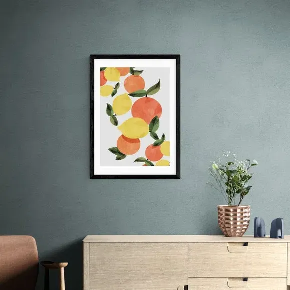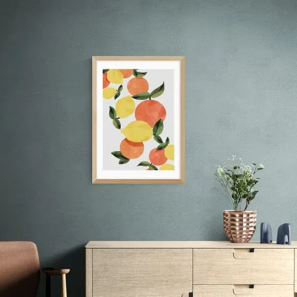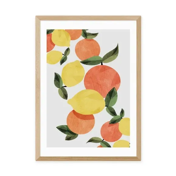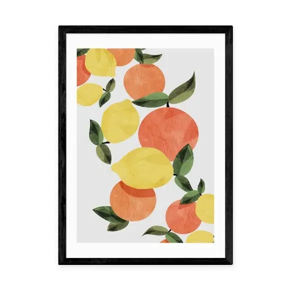 * Artwork by Dan Hobday* Available in A1, A2, A3 & A4 sizes* Obeche Wood Frames available in black, white and oak effect* You can buy the print unframed too!* Prints are made using the Giclee printing process, lasting up to 70 years from fading* Printed on 210gsm acid free archival paper with a digital white border Brighten your space with this stunning print from Dan Hobday, featuring a refreshing blend of citrus hues that evoke a sense of zest and vitality. Perfect for adding a warm and colourful touch to your kitchen or dining space. You are able to customise the size and frame for this print! Choose from a variety of frame options and then pick your size. This way you can find the best design to suit your home interior.