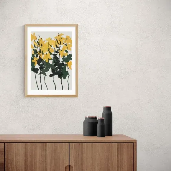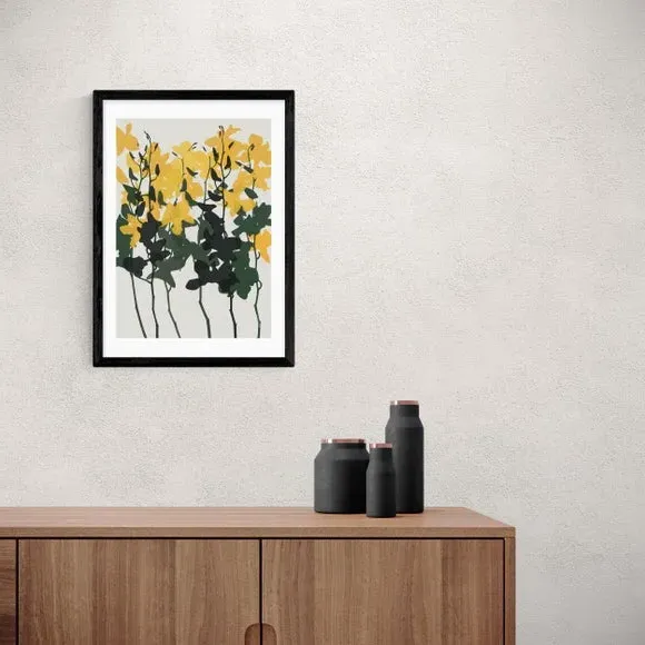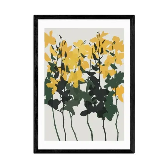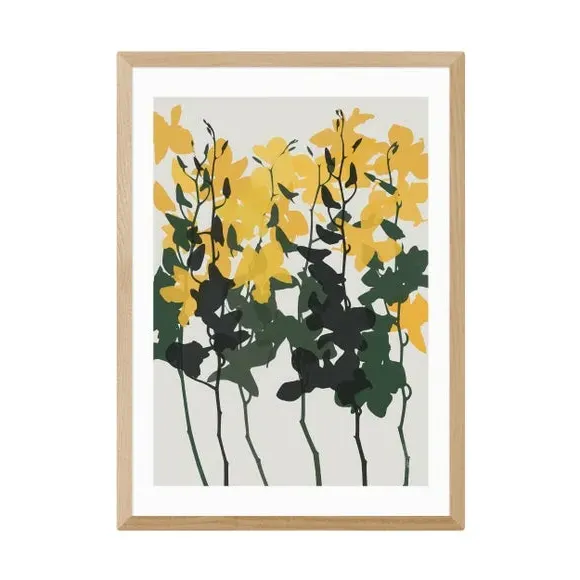 * Artwork by Garima Dhawan* Floral style* Printed on 210gsm acid-free archival paper* Available in A1, A2, A3 & A4 size* Frames available: black, white and oak effect* You can buy the print unframed too! Catch your guests eye when you hang this Garima Dhawan print. Bold yellow orchid petals rest upon contrasting leaves, creating a colourful design. You are able to customise the size and frame for this print! Choose from a variety of frame options and then pick your size. This way you can find the best design to suit your home interior. Each piece of artwork has gone through a giclee printing process which will help the print stay vibrant for years to come to keep your home looking fresh.