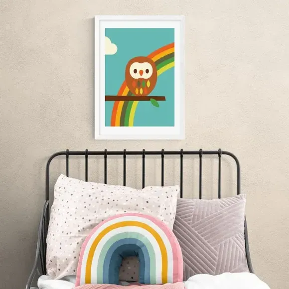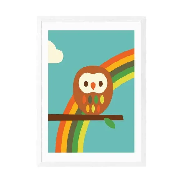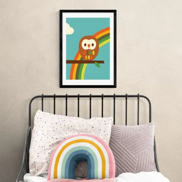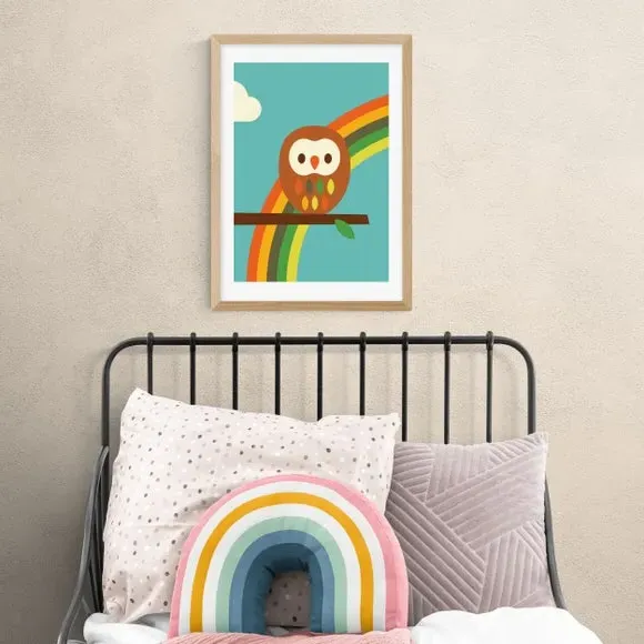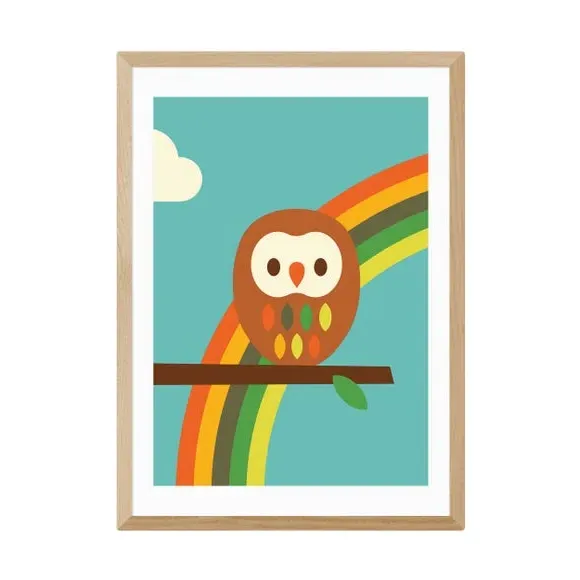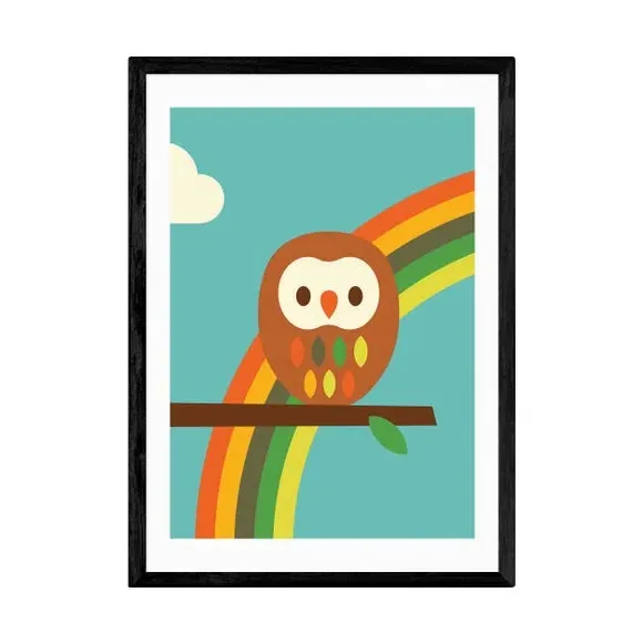 The wall print features vibrant owl and rainbow artwork with animals-style design. Its giclee printing process on 210gsm acid-free archival paper provides long-lasting color vibrancy, while the high-quality paper ensures durability. The print offers multiple size options from A4 to A1, and frame choices include black, white, and oak effect finishes for versatile display options.