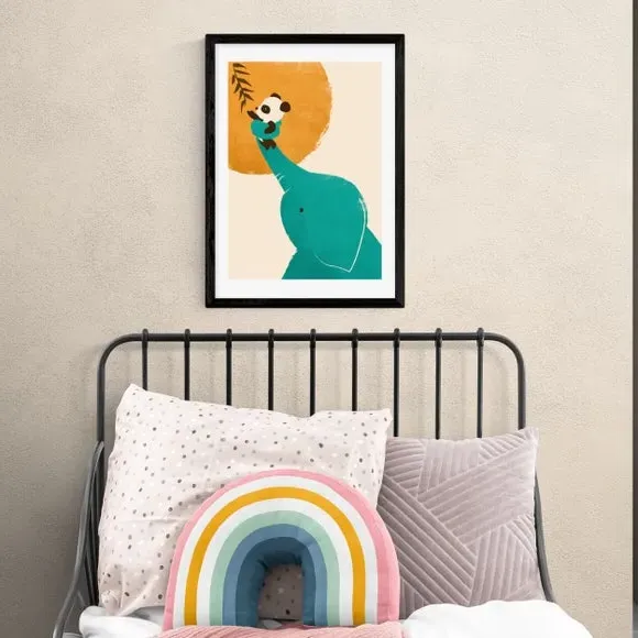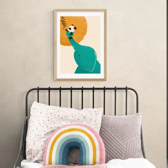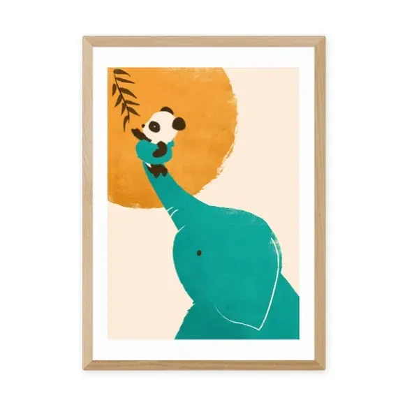 * Artwork by Jay Fleck* Adorable animal design* Portrait orientation* Printed on 210gsm acid-free archival paper* Available in A1, A2, A3 & A4 size* Frame options: black, white and oak wood effect* Available in unframed option Complete a playroom, nursery or bedroom with this adorable animal themed print by Jay Fleck. Made using a Giclee printing process to prevent fading, this children’s print features a kind elephant supporting his panda friend to reach some leaves. This cute cartoon animal artwork will stay vibrant for years to come and each design is available in three print sizes and a variety of frame options, including unframed, so you can display your artwork however you wish.