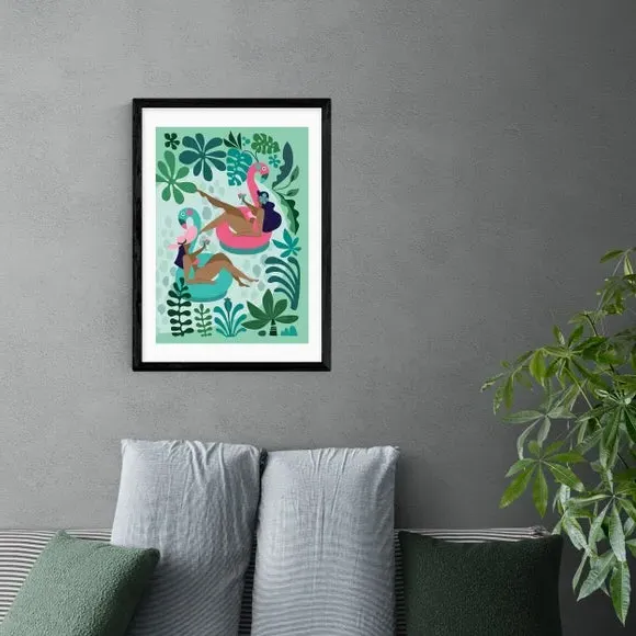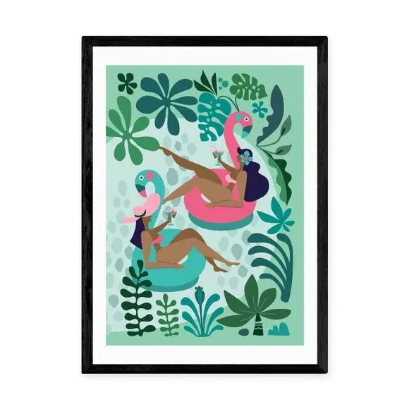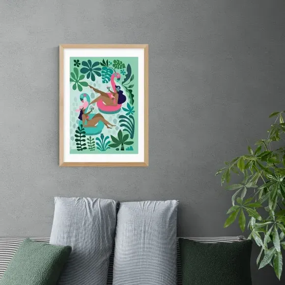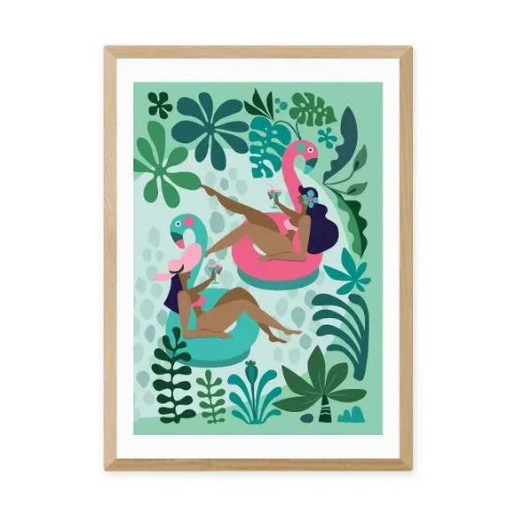 * Artwork by Rachel Lee* Graphic print* Portrait orientation* Printed on 210gsm acid-free archival paper* Available in A1, A2, A3 & A4 sizes* Frame options: black, white and oak wood effect* Available in unframed option Enjoy pool party fun all year round with this bright and playful illustrative print, featuring two bronzed girls in a pool, on inflatables and captured amongst pretty floral shapes. Made using a Giclee printing process to prevent fading, this wonderful print will stay vibrant for years to come. Each design is available in four print sizes and a variety of frame options, including unframed, so you can display your artwork however you wish.