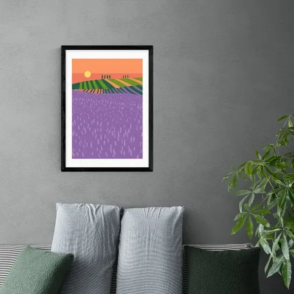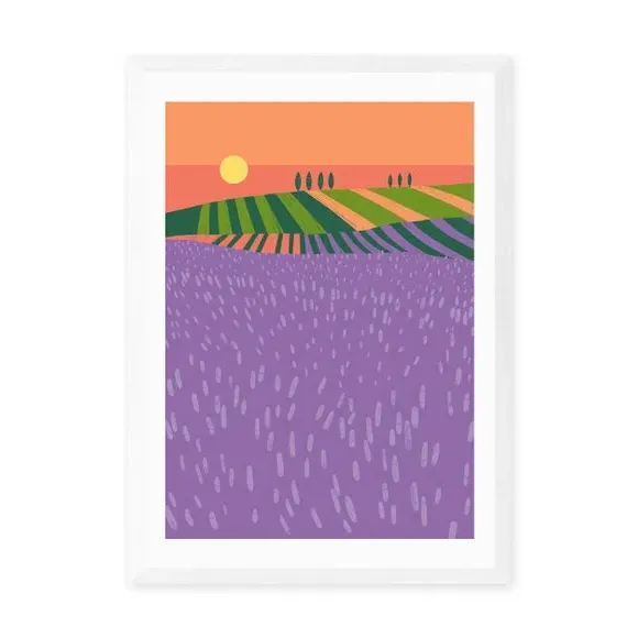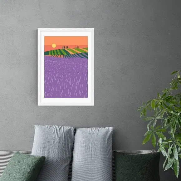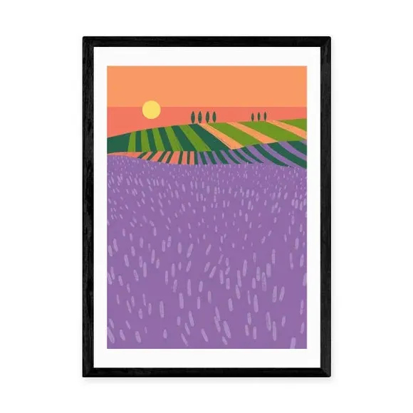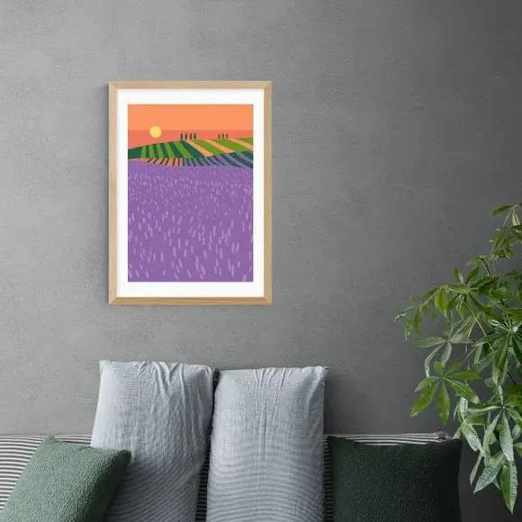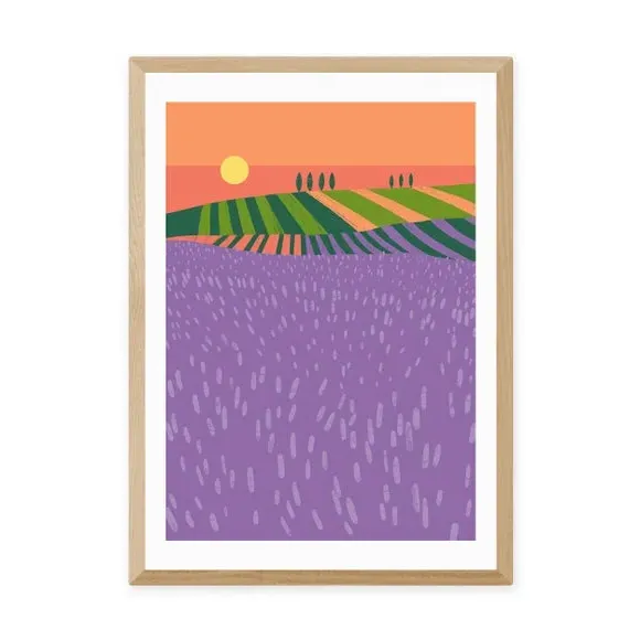 * Artwork by Anek* Abstract landscape scene* Portrait orientation* Printed on 210gsm acid-free archival paper* Available in A1, A2, A3 & A4 sizes* Frame options: black, white and oak wood effect* Available in unframed option Transport yourself to vibrant purple fields of lavender and contrasting coral sunsets with this landscape scene by Anek. Made using a Giclee printing process to prevent fading, this wonderful print is ideal for a living space or hallway and will stay vibrant for years to come. Each design is available in four print sizes and a variety of frame options, including unframed, so you can display your artwork however you wish.