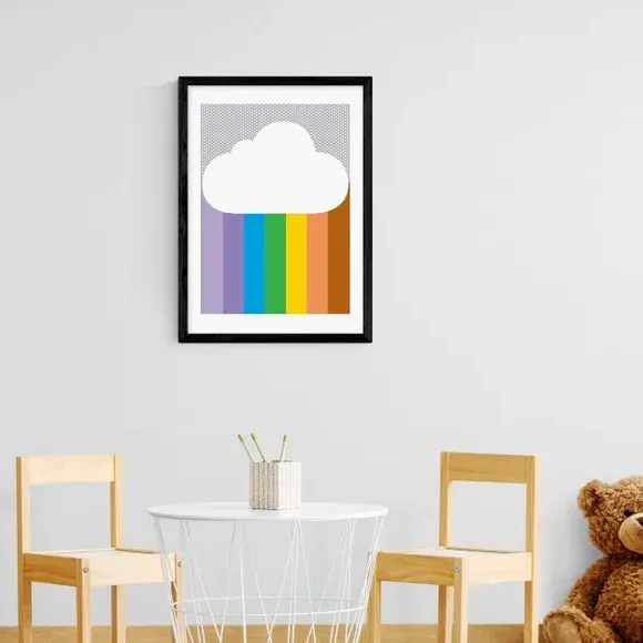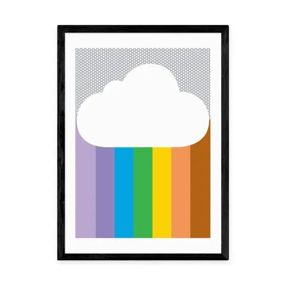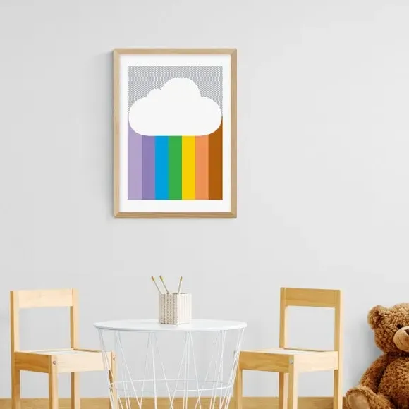 The Rainbow Cloud Print features vibrant rainbow graphics in portrait orientation, printed on 210gsm acid-free archival paper. Its Giclee printing process ensures lasting color vibrancy and prevents fading over years, while the high-quality archival paper provides durability. The print offers multiple size options from A4 to A1, with frame choices including black, white, and oak wood effect finishes.