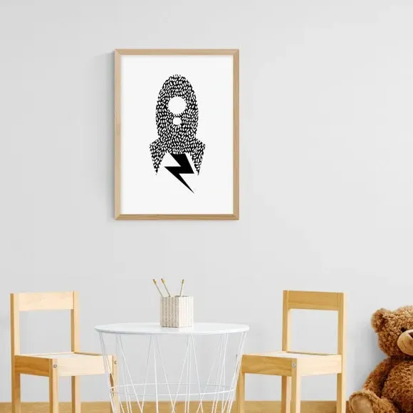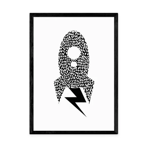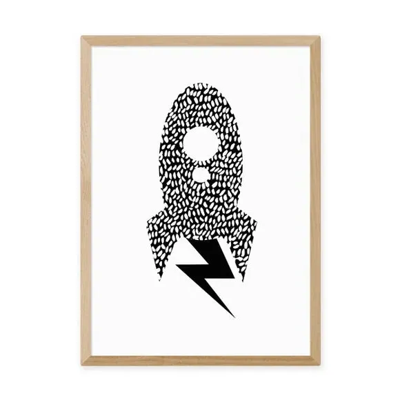 * Artwork by Wonder and Rah* Monochrome space rocket theme* Portrait orientation* Printed on 210gsm acid-free archival paper* Available in A1, A2, A3 & A4 sizes* Frame options: black, white and oak wood effect* Available in an unframed option Jet off to outer space with this simple monochrome silhouette style rocket print by Wonder and Rah. Perfect for kids and adults alike, this artwork will bring character and excitement to your walls and is made to last as it uses a Giclee printing process to stay vibrant and prevent fading over years. Each design is available in four print sizes and a variety of frame options, including unframed, so you can display your artwork however you wish.