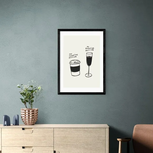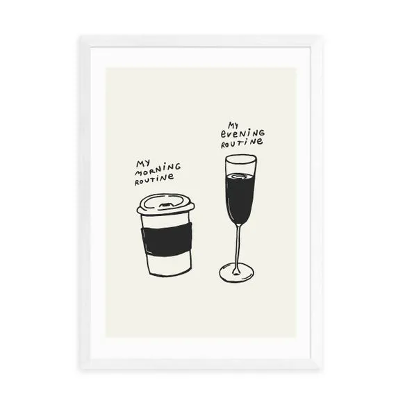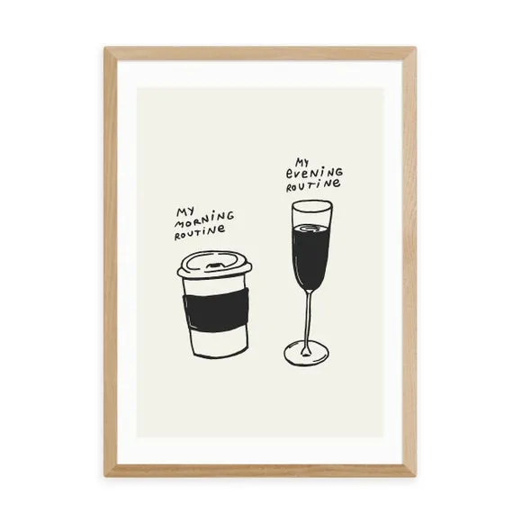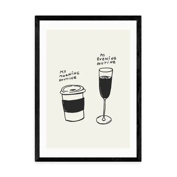 * Artwork by Tartagain* Available in A1, A2, A3 & A4 sizes* Obeche Wood Frames available in black, white and oak effect* You can buy the print unframed too!* Prints are made using the Giclee printing process, lasting up to 70 years from fading* Printed on 210gsm acid free archival paper with a digital white border Embrace the charm of daily rituals with this whimsical Routines print by Tartagain, a playful addition to your kitchen or coffee nook. This print showcases a simple, charming black and white line drawing of two coffee cups, capturing the warmth of daily routines in a minimalist style. You are able to customise the size and frame for this print! Choose from a variety of frame options and then pick your size. This way you can find the best design to suit your home interior.
