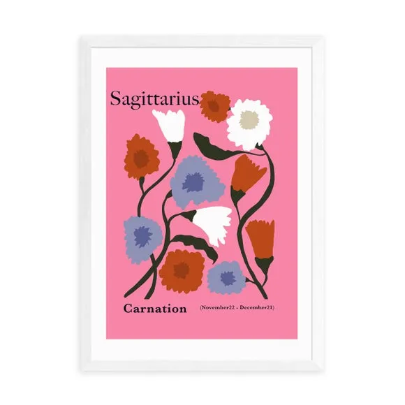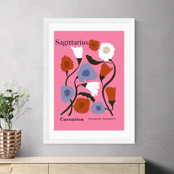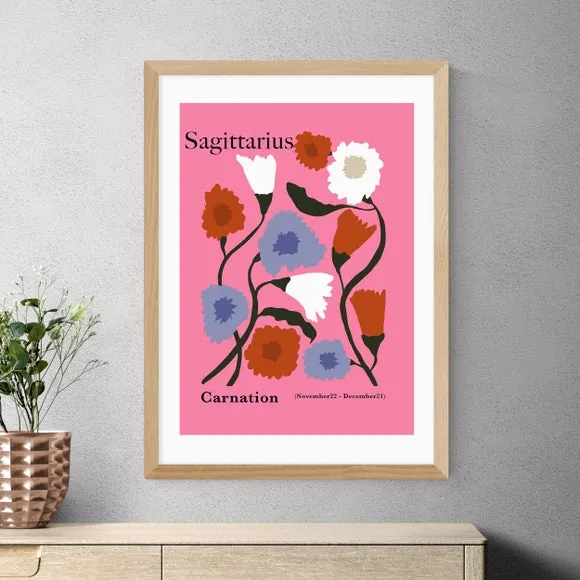 The Sagittarius art print features carnation motifs inspired by the zodiac sign, rendered in soft pink tones. Printed on 210gsm acid-free archival paper with giclee technology, it provides vibrant colors that last up to 70 years. The digital white border adds a polished finish, while multiple size options from A4 to A1 accommodate various spaces. Frame choices include black, white, oak effect, or unframed to suit different decor styles.