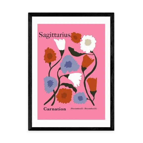 * Sagittarius Inspired* Artwork by Miho Art Studio* Printed on 210GSM Acid-Free Archival Paper* Available in A1, A2, A3, & A4 Sizes* Frame Options: Black, White, Oak Effect, & Unframed Brighten your home with this pink-themed print of carnations, inspired by the Sagittarius star sign. Select the perfect frame and size to suit your decor. Printed on 210gsm acid-free archival paper, it includes a digital white border for a polished look. The giclee printing process ensures long-lasting vibrancy for up to 70 years. Please Note: For every print sold, a percentage of profit is donated to Cool Earth - a charity combating deforestation in the rainforest.