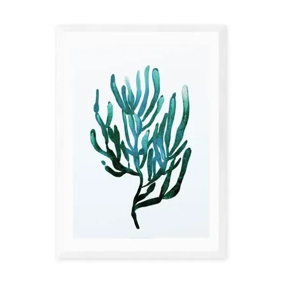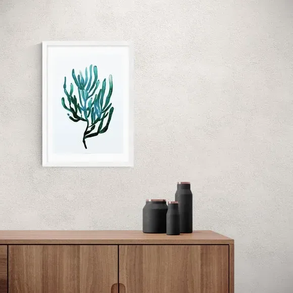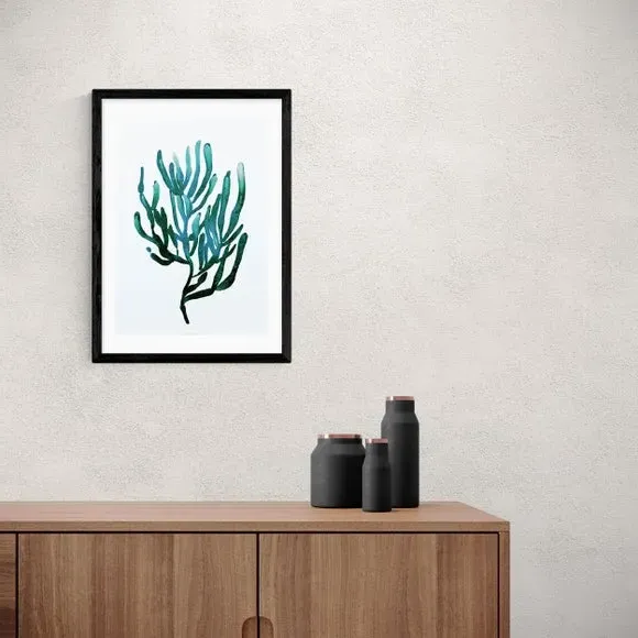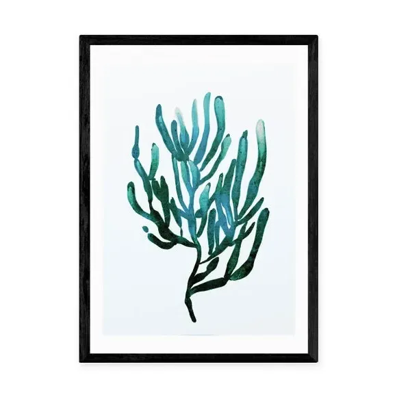 * Artwork by Dan Hodbday * Coastal theme* Portrait orientation* Printed on 210gsm acid-free archival paper* Available in A1, A2, A3 & A4 sizes* Frame options: black, white and oak wood effect* Available in unframed option Embrace seaside vibes and teal tones with this stunning artwork by Dan Hobday. Featuring a graceful seaweed design, this print will bring a reminder of coastal trips and adventures to your home. Made using a Giclee printing process to prevent fading, this print will stay vibrant for years to come and Each design is available in four print sizes and a variety of frame options, including unframed, so you can display your artwork however you wish.