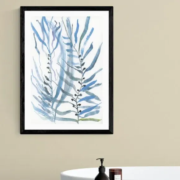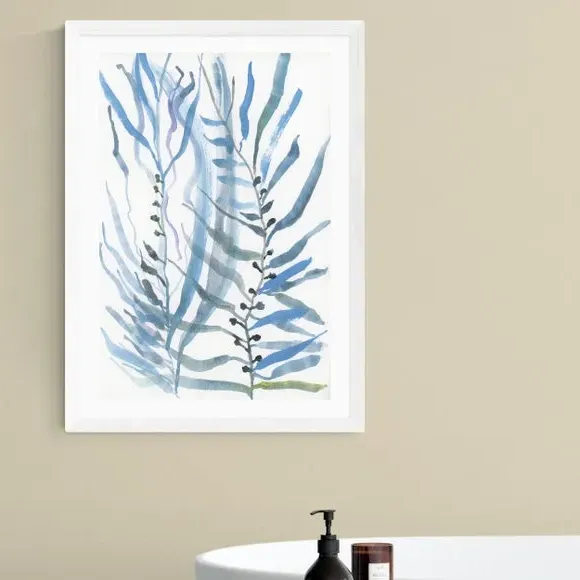 The seaweed wall print features graceful blue botanical motifs with coastal styling. Its giclee printing process provides fade resistance lasting up to 70 years, while the 210gsm acid-free archival paper ensures durability. The print offers framing options in black, white and oak effect finishes, and the high-quality construction maintains vibrant colors over time.