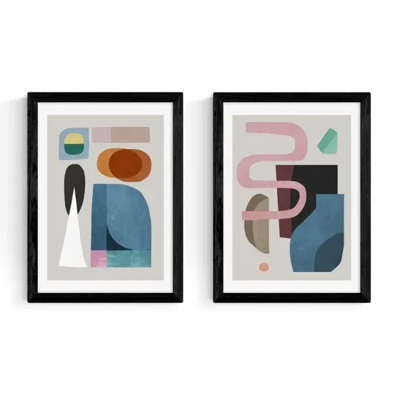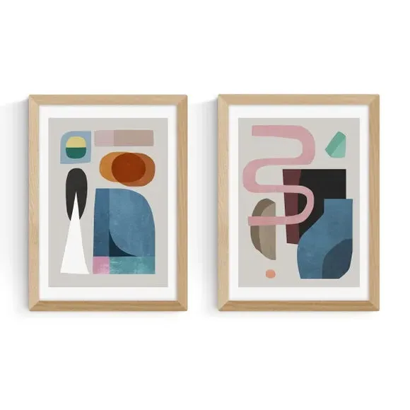 The wall print set features multicolored abstract shapes printed on 210gsm acid-free archival paper. Its contemporary design offers versatility for display together or separately throughout your space. The prints come with frame options in black, white, and oak wood effect, while the unframed option provides flexibility for custom presentation.