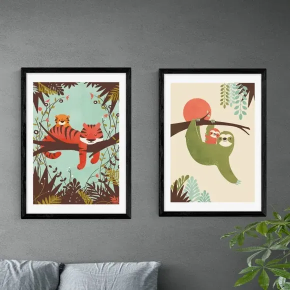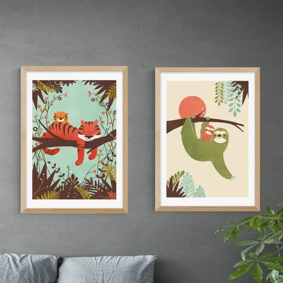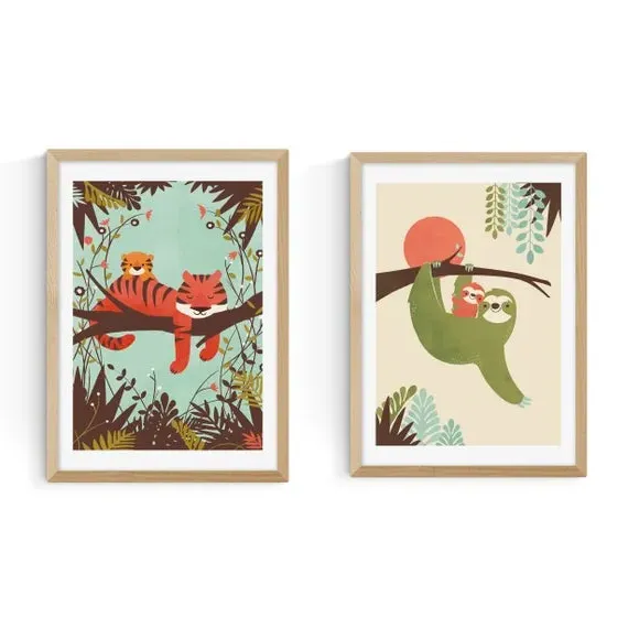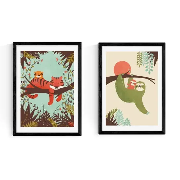 * Includes 2 prints* Artwork by Jay Fleck* Animals style* Printed on 210gsm acid-free archival paper* Available in A1, A2, A3 & A4 sizes* Frames available: black, white and oak effect* You can buy the print unframed too! The perfect homely animal print combo. One features adorable tigers and the other some hanging sloths. You are able to customise the size and frame for this print! Choose from a variety of frame options and then pick your size. This way you can find the best design to suit your home interior. Each piece of artwork has gone through a giclee printing process which will help the print stay vibrant for years to come to keep your home looking fresh.