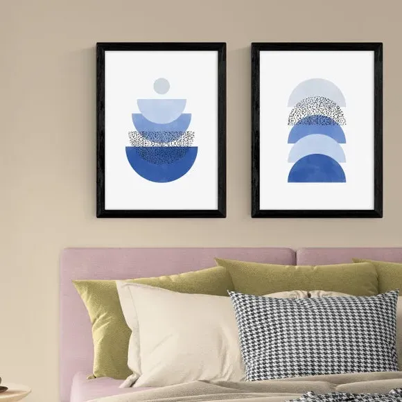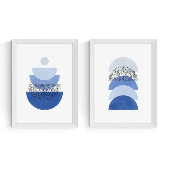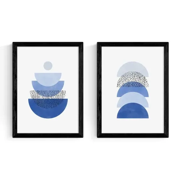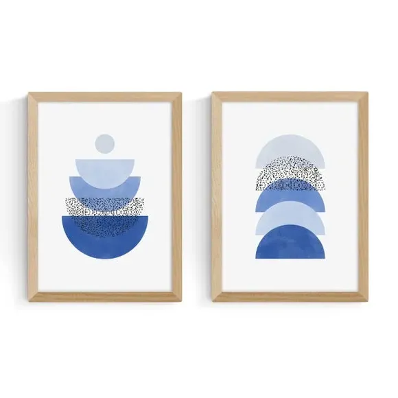 * Artwork by The Print Republic* Abstract style* Available in A1, A2, A3 & A4 sizes* Giclee printing process lasting up to 70 years from fading* Printed on 210gsm acid-free archival paper* Frames available: black, white and oak effect* Also available unframed Modern, striking, and effortlessly stylish — this set of two abstract prints by The Print Republic features bold blue geometric shapes that bring a fresh, contemporary edge to any room. East End Prints are proudly printed and made in the UK, with a royalty paid to the artist for every print sold.