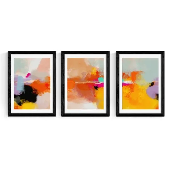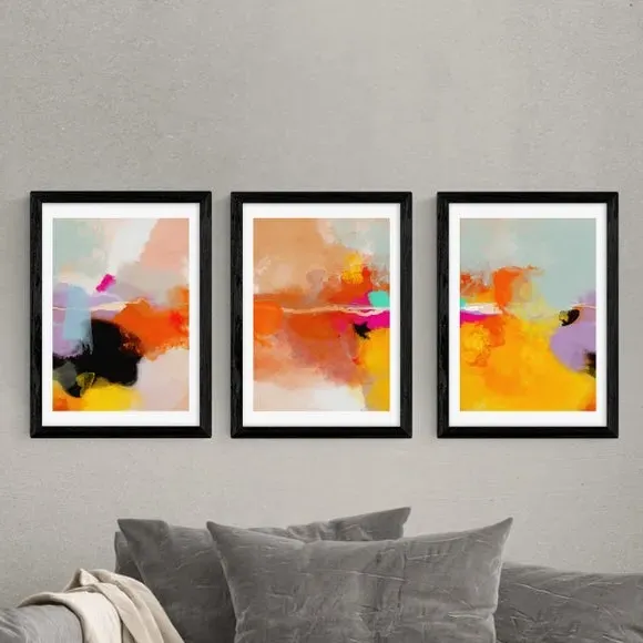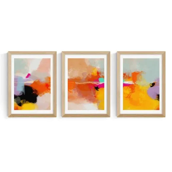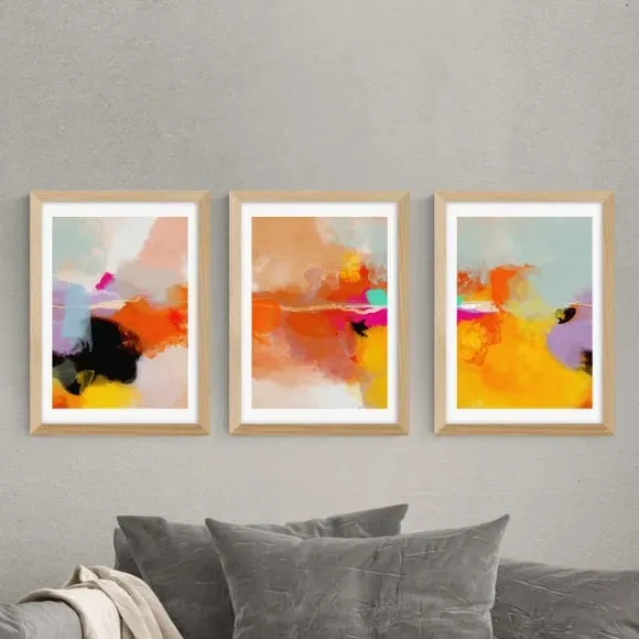 The framed print set features watercolour artwork by Ana Rut Bre, printed on 210gsm acid-free archival paper. Each piece combines warm yellow and blush tones with giclee printing technology that maintains vibrant colours over time. The prints are available in multiple sizes from A4 to A1, while frame options include black, white, and oak effect finishes. The archival-quality paper construction ensures long-lasting durability and colour retention.