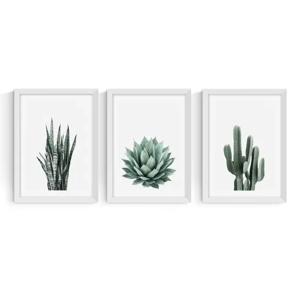The wall print set features three botanical succulent artworks with floral styling in vibrant green tones. Each print uses giclee printing on 210gsm acid-free archival paper, ensuring long-lasting color vibrancy and quality. The set offers multiple size options from A4 to A1, while frame choices include black, white, and oak effect finishes. The archival paper construction provides durability and fade resistance for years of display.