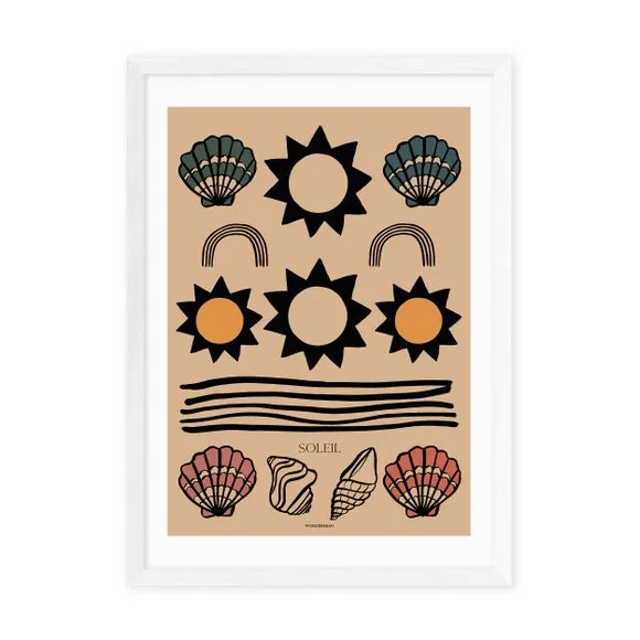 The Soleil Tapestry print features coastal-inspired seascape illustrations including shells and sun designs with a tapestry-style aesthetic. Printed on 210gsm acid-free archival paper using fade-resistant Giclee printing, it combines durability with vibrant color retention. The print offers multiple frame options in black, white, and oak wood effect finishes, while also being available unframed to suit different display preferences.