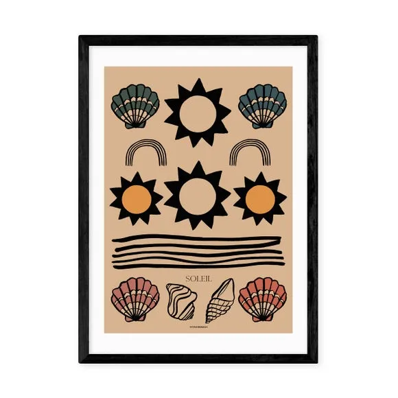 * Tapestry style design* Coastal feel* Printed on 210gsm acid-free archival paper* Available in A1, A2, A3 & A4 sizes* Frame options: black, white and oak wood effect* Available in an unframed option Bring a coastal feel to your living space with this 'Soleil Tapestry' print by Wonder and Rah. It features an array of seascape inspired illustrations including shells and sun designs. Created using fade-resistant Giclee printing, it's available in a range of frame options and sizes to suit your space.
