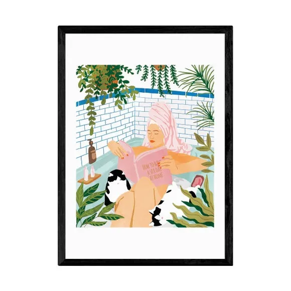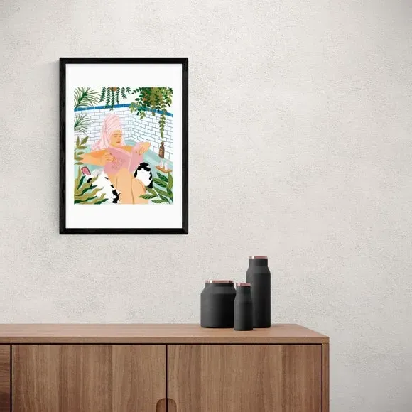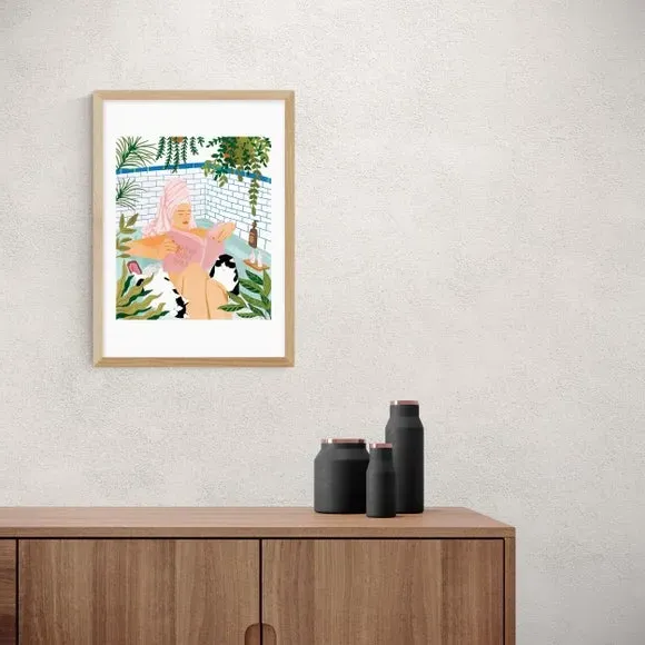 The wall print features figurative artwork with relaxing spa day imagery, printed on 210gsm acid-free archival paper. Its giclee printing process maintains vibrant colors over time, while the archival quality paper resists fading and deterioration. The print comes with multiple size options from A4 to A1, and frame choices include black, white, and oak effect finishes.
