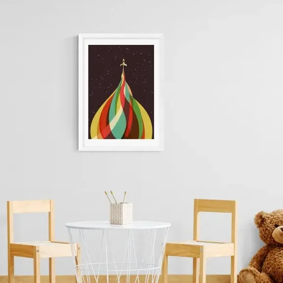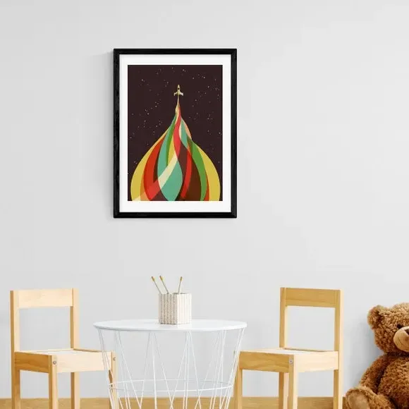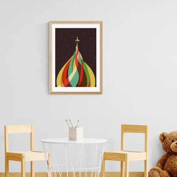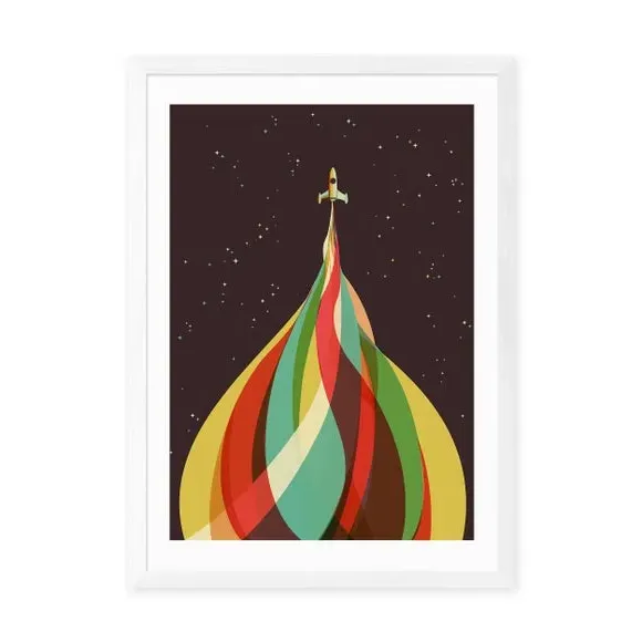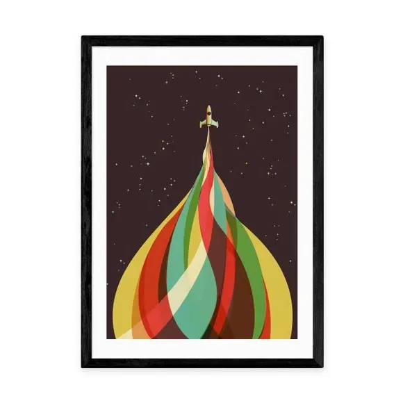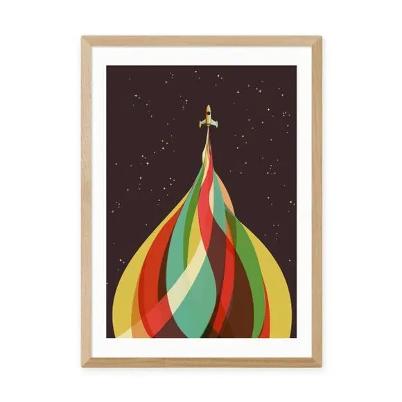 * Artwork by Jay Fleck* Space theme print* Portrait orientation* Printed on 210gsm acid-free archival paper* Available in A1, A2, A3 & A4 sizes* Frame options: black, white and oak wood effect* Available in an unframed option Shoot off to outer space with this bright and aspirational rocket print, perfect for kids and adults alike. Perfect for bringing colour and character to your walls, this print is made to last as it uses a Giclee printing process to stay vibrant and prevent fading over years. Each design is available in four print sizes and a variety of frame options, including unframed, so you can display your artwork however you wish.