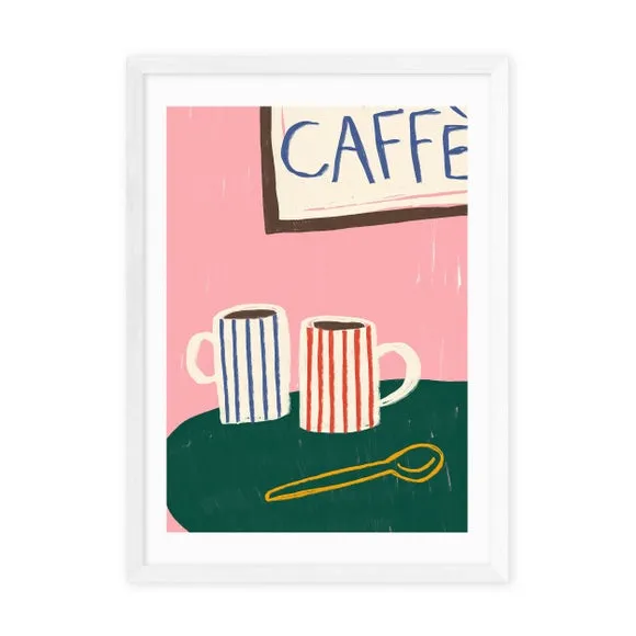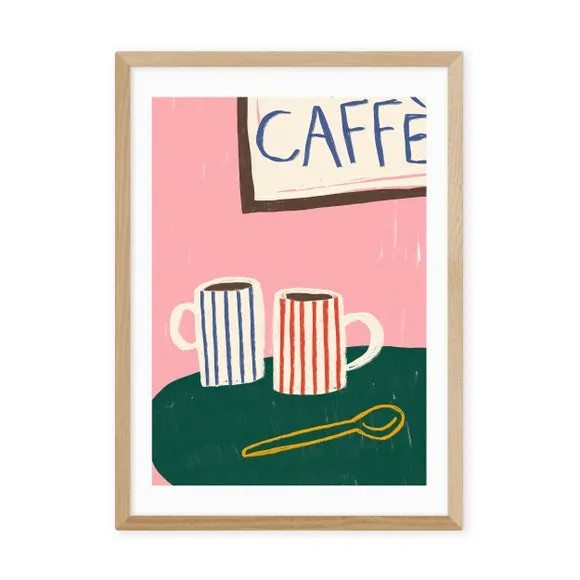 * Stylised mugs design* Bright, vibrant colour* Fade-resistant* Printed on 210gsm acid-free archival paper* Available in A1, A2, A3 & A4 size* Frame options: black, white and oak wood effect* Available in unframed option Bring a slice of vibrant Café culture into your home with this stylised print, featuring mugs and a 'Caffé' sign. The bright, contrasting colours make for a great display piece, ideal as part of a gallery wall or in a kitchen or dining area. Choose from a range of solid wood frame options and sizes to best suit your decor, or unframed so that you can display it in your own style.