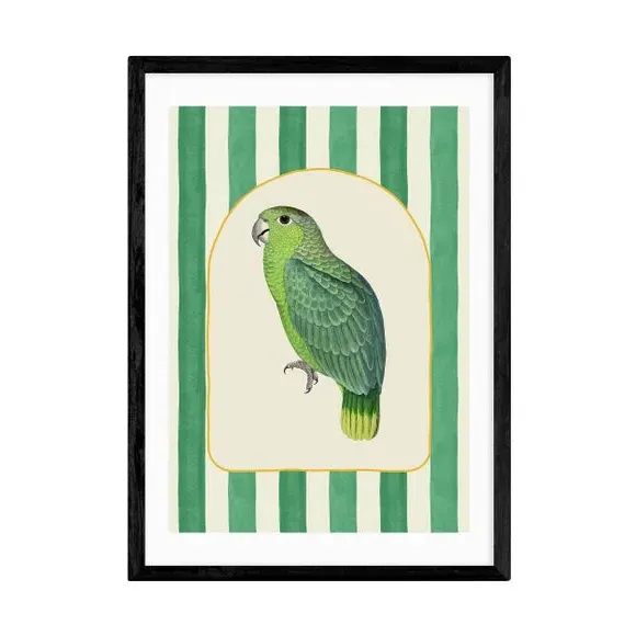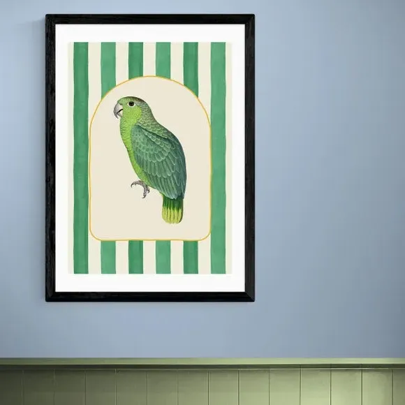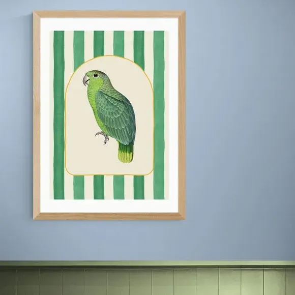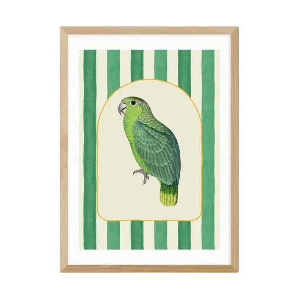 * Artwork by Oh Fine! Art* Animals style* Available in A1, A2, A3 & A4 sizes* Giclee printing process lasting up to 70 years from fading* Printed on 210gsm acid-free archival paper* Frames available: black, white and oak effect* Also available unframed Bright, playful, and full of tropical energy — this animal print by Oh Fine! Art captures the vibrant spirit of a stripy green parrot. A fun and colourful way to bring life and personality to your walls. East End Prints are proudly printed and made in the UK, with a royalty paid to the artist for every print sold.