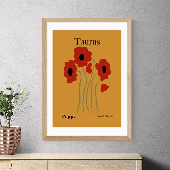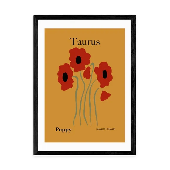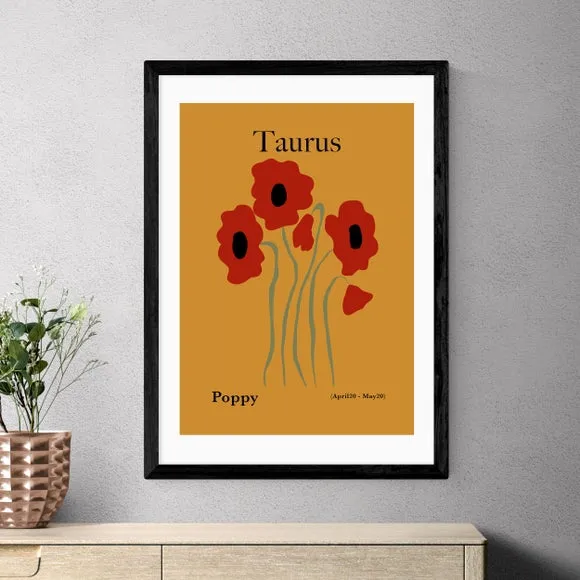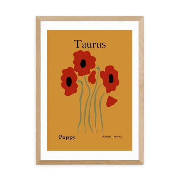 * Taurus Inspired* Artwork by Miho Art Studio* Printed on 210GSM Acid-Free Archival Paper* Available in A1, A2, A3, & A4 Sizes* Frame Options: Black, White, Oak Effect, & Unframed Celebrate the bold nature of Taurus with this striking print of poppies. Customise your piece by picking from various frame options and sizes. Crafted on 210gsm acid-free archival paper, it features a digital white border for a clean look. The giclee printing process ensures your print remains vibrant and fade-resistant for up to 70 years. Please Note: For every print sold, a percentage of profit is donated to Cool Earth - a charity combating deforestation in the rainforest.