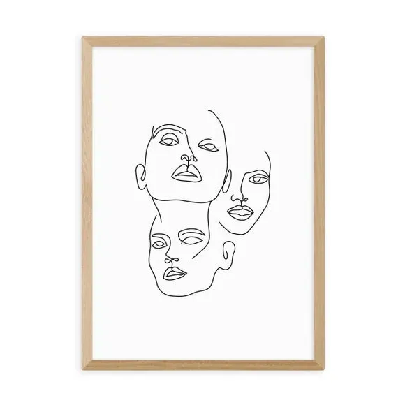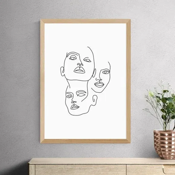 The Three Line Art Faces Print features minimalist line art design with clean geometric forms. Its Giclee printing process ensures fade resistance for up to 70 years, while the 210gsm acid-free archival paper provides durability and quality. The print includes a digital white border and comes with optional Obeche wood frame choices in black, white, or oak effect finishes.