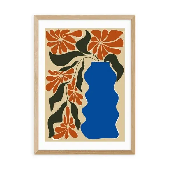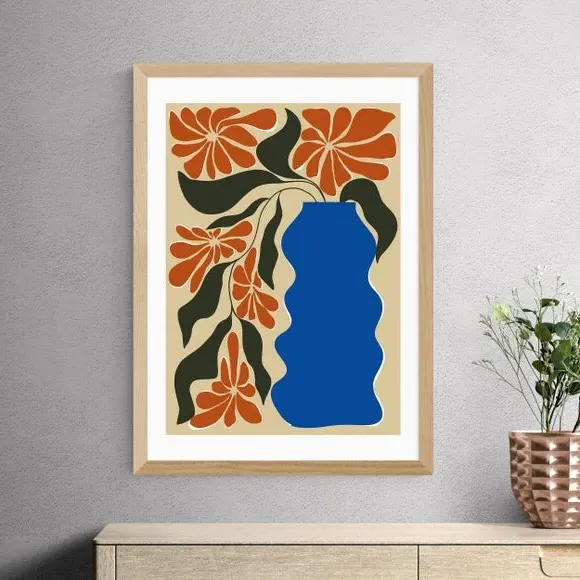 The tropical flower pot art print features vibrant floral imagery created using the Giclee printing process. Its 210gsm acid-free archival paper construction provides fade resistance for up to 70 years, while the digital white border adds a clean finish. The print offers multiple size options from A4 to A1, with frame choices including black, white, and oak effect Obeche wood. Available both framed and unframed to suit different display preferences.