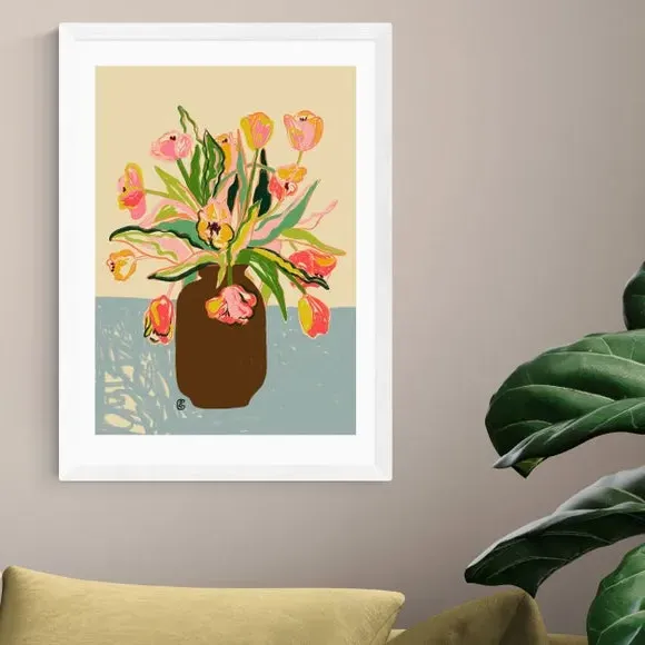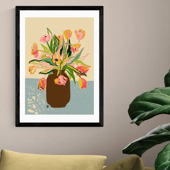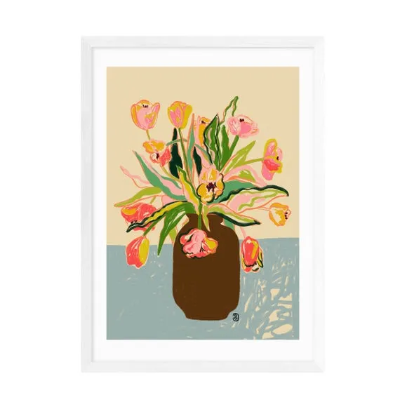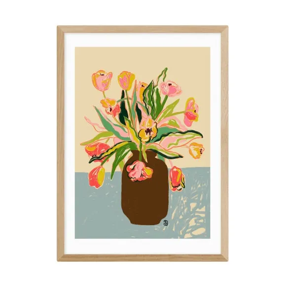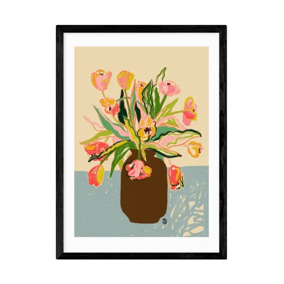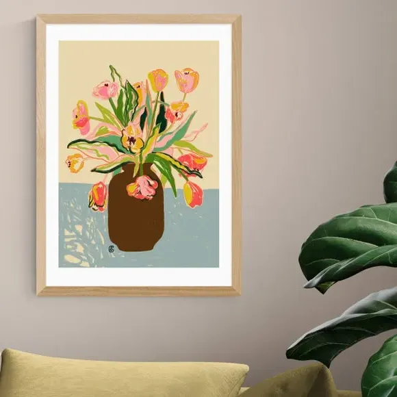 * Artwork by Sandra Poliakov* Floral style* Available in A1, A2, A3 & A4 sizes* Giclee printing process lasting up to 70 years from fading* Printed on 210gsm acid-free archival paper* Frames available: black, white and oak effect* Also available unframed Elegant, vibrant, and beautifully detailed — this floral print by Sandra Poliakov brings the fresh charm of tulips into your home. Its delicate colours and graceful design add a timeless touch to any space. East End Prints are proudly printed and made in the UK, with a royalty paid to the artist for every print sold.