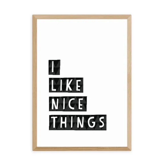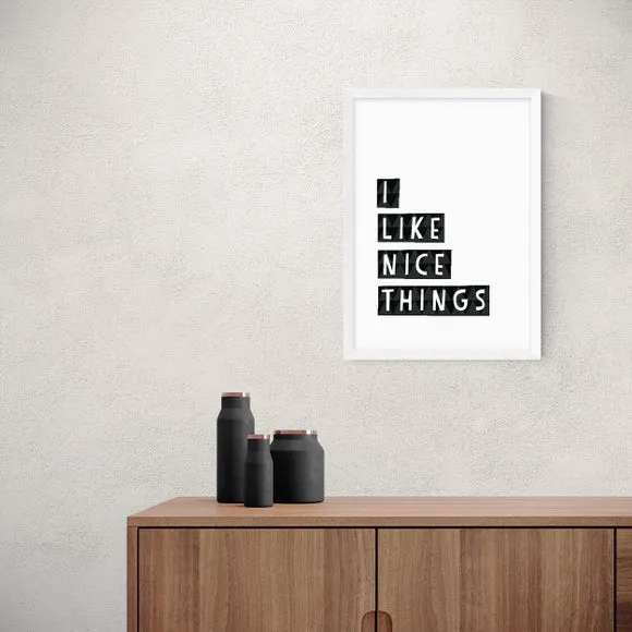 * Artwork by Seventy Tree* Typographic wording* Portrait orientation* Printed on 210gsm acid-free archival paper* Available in A1, A2, A3 & A4 size* Frame options: black, white and oak wood effect* Available in unframed option Simple and quirky, the statement, “I like nice things” is ideal motivation for placing in your bedroom or closet to encourage and inspire those nice things in your house. This typographic print by Seventy Tree uses a Giclee printing process to prevent fading, so this artwork will remain fresh for years to come. Each design is available in four print sizes and a variety of frame options, including unframed, so you can display your artwork however you wish.