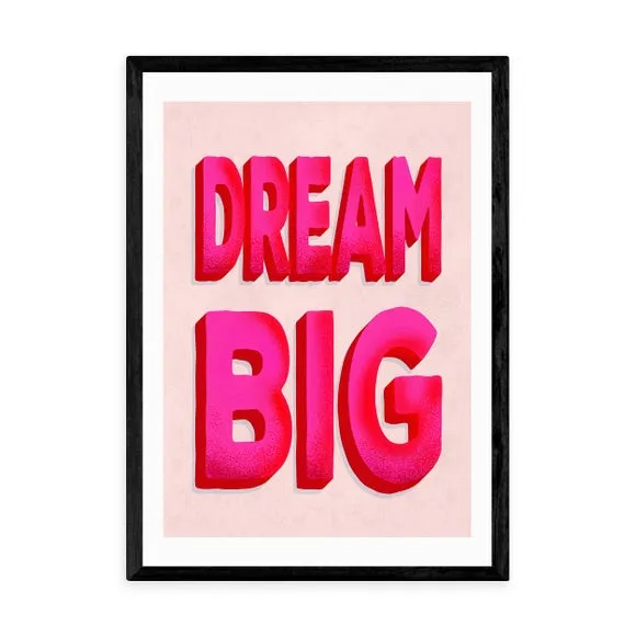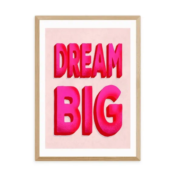 * Artwork by Show Me Mars* Typographic print* Portrait orientation* Printed on 210gsm acid-free archival paper* Available in A1, A2, A3 & A4 sizes* Frame options: black, white and oak wood effect* Available in unframed option Fill your day with motivation and ambition with the simple and vibrant typographic print with an encouraging “DREAM BIG” statement. Perfect to place in your bedroom or workspace this print will brighten your day and boost your mood. Made using a Giclee printing process to prevent fading, this wonderful print will stay vibrant for years to come. Each design is available in four print sizes and a variety of frame options, including unframed, so you can display your artwork however you wish.