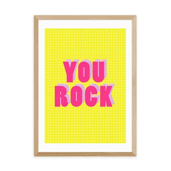 The typographic wall print offers uplifting motivation with its bold 'You Rock' message in portrait orientation. Printed on 210gsm acid-free archival paper using Giclee printing process, it provides vibrant colors that resist fading over years. The print comes in multiple size options from A4 to A1, while frame choices include black, white, oak wood effect, or unframed display.
