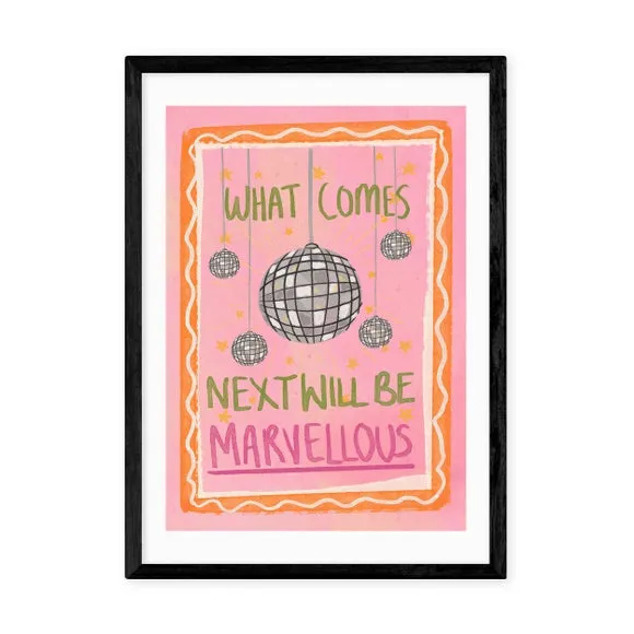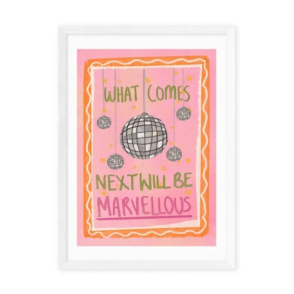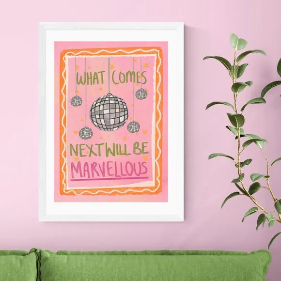 * Bright, vibrant design* 'What Comes Next' typography* Printed on 210gsm acid-free archival paper* Available in A1, A2, A3 & A4 sizes* Frame options: black, white and oak wood effect* Available in an unframed option Add colour and an uplifting message to your space with this fade-resistant piece. 'What Comes Next Will Be Marvellous' is illustrated in stylised typography with fabulous glitterballs and a contrasting border. Available in a choice of sizes and frame options, it's a great way to refresh your decor.