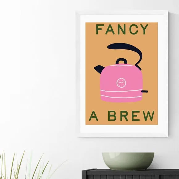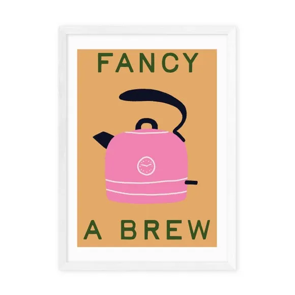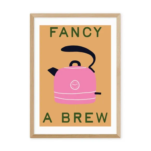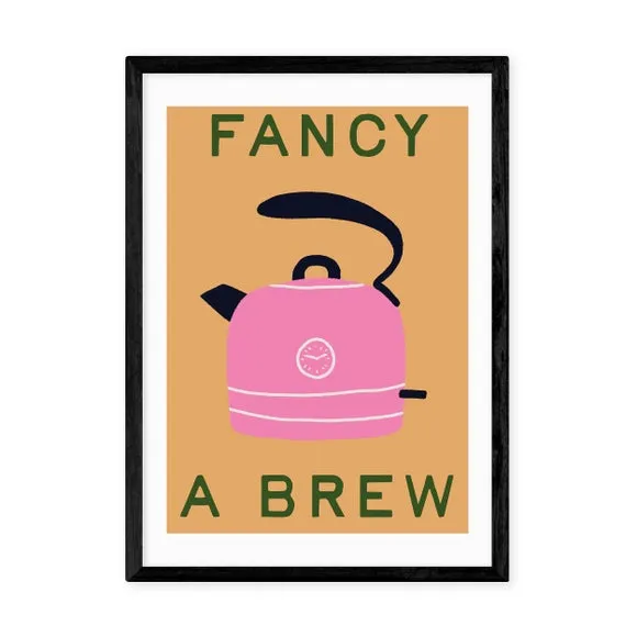 * 'Fancy a Brew' typography* Bright orange and pink colour* Great for kitchens or dining areas* Printed on 210gsm acid-free archival paper* Available in A1, A2, A3 & A4 sizes* Frame options: black, white and oak wood effect* Available in an unframed option Welcome guests with a cuppa with this 'Fancy a Brew' typography print, in bold and bright fade-resistant colours. Available unframed or in a range of solid wood frame options, this print comes in A1, A2, A3 or A4 sizes to create just the right feature on your walls.