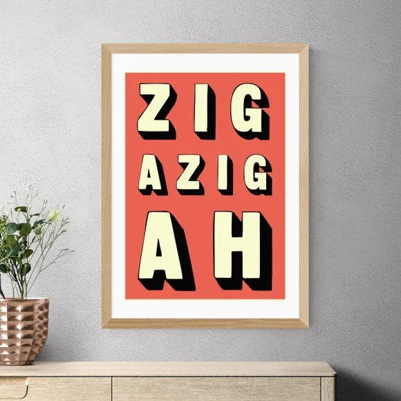 The typography wall print features vibrant red lettering with Giclee printing technology that resists fading for up to 70 years. Printed on 210gsm acid-free archival paper, it includes a clean digital white border that frames the design. Available in multiple sizes from A4 to A1, with optional Obeche wood frames in black, white, or oak effect finishes.