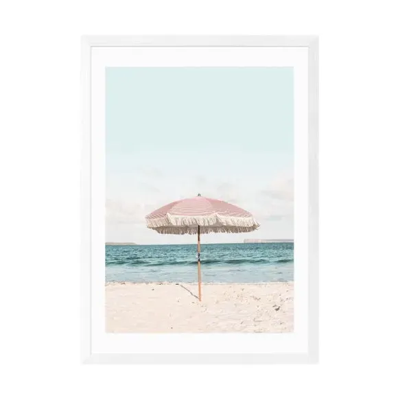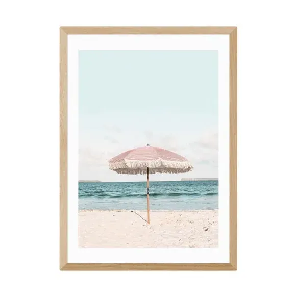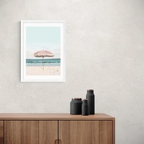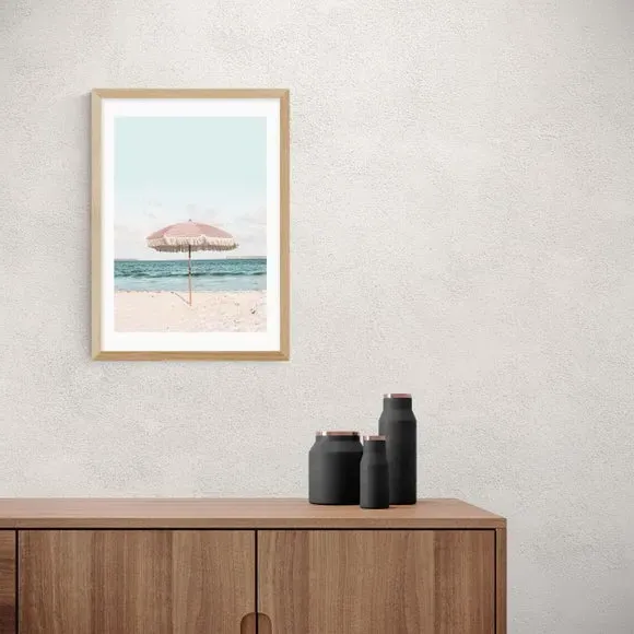 The wall print features a beach umbrella design with travel-style artwork printed on 210gsm acid-free archival paper. Its giclee printing process provides vibrant colors that resist fading over time, while the archival quality paper ensures long-lasting durability. The print offers multiple size options from A4 to A1, and frame choices include black, white, and oak effect finishes.