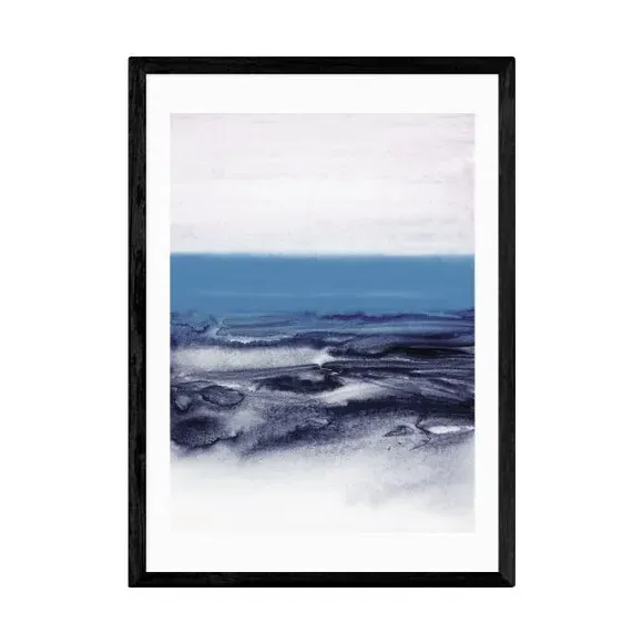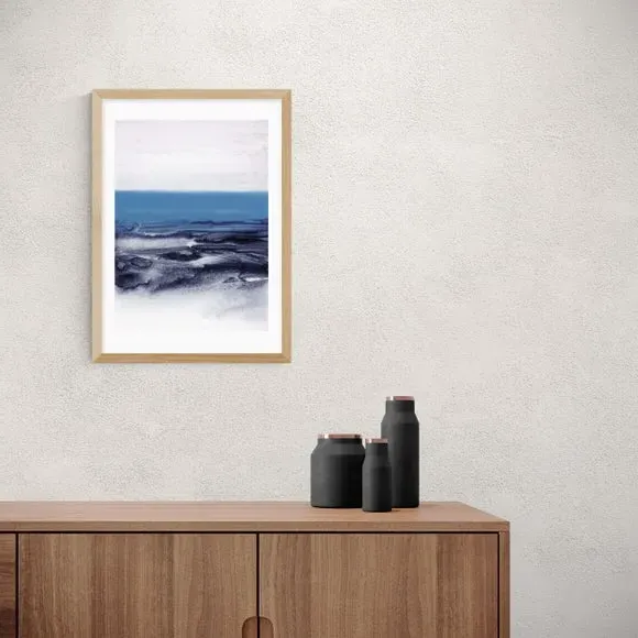 The watercolor landscape print features coastal-style artwork with flowing navy waves that create a calming atmosphere. Printed on 210gsm acid-free archival paper using giclee printing process, ensuring vibrant colors that last for years. The print offers multiple size options from A4 to A1, with frame choices in black, white, and oak effect finishes. Its archival-quality paper construction provides durability and color retention over time.