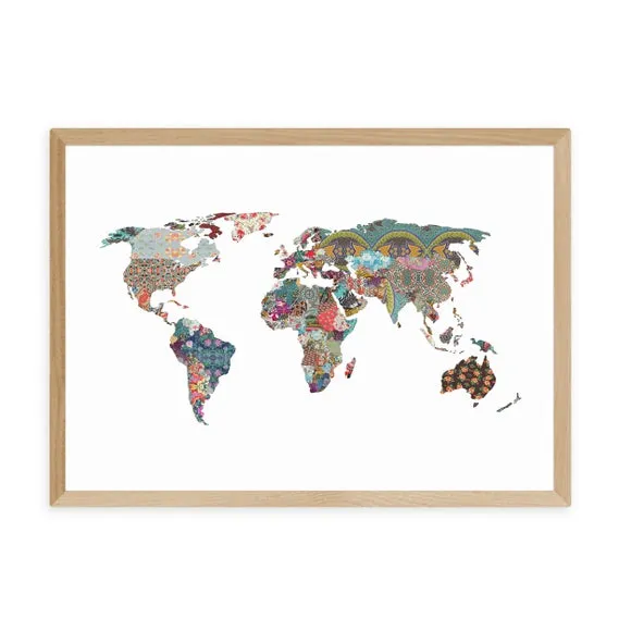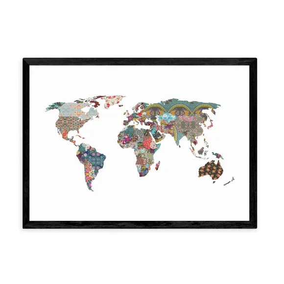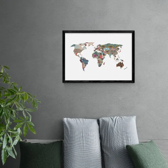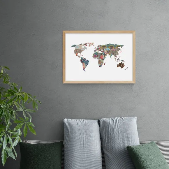 * Artwork by Bianca Green* World map design* Decorative abstract style* Landscape orientation* Printed on 210gsm acid-free archival paper* Available in A1, A2, A3 & A4 size* Frame options: black, white and oak wood effect* Available in unframed option Bring travel inspired art to your bedroom, home office or living space with the abstract style and world map design in this artwork by Bianca Green. Made using a Giclee printing process to prevent fading, this print can add curiosity, style and colour to your home and will stay vibrant for years to come. Each design is available in four print sizes and a variety of frame options, including unframed, so you can display your artwork however you wish.