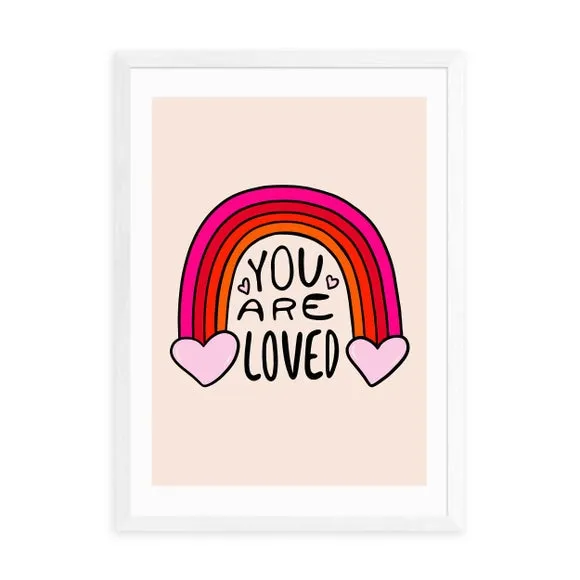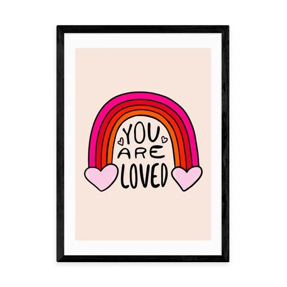 * Artwork by Artwork by Meg* Available in A1, A2, A3 & A4 sizes* Frames available: black, white and oak effect* You can buy the print unframed too! Infuse your space with love and positivity with the " You are loved" Print by Doodle By Meg. This whimsical and heartfelt artwork is a beautiful reminder of the affection that surrounds you. You are able to customise the size and frame for this print! Choose from a variety of frame options and then pick your size. This way you can find the best design to suit your home interior. Each piece of artwork has gone through a giclee printing process which will help the print stay vibrant for years to come to keep your home looking fresh.