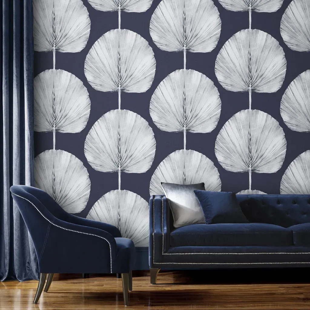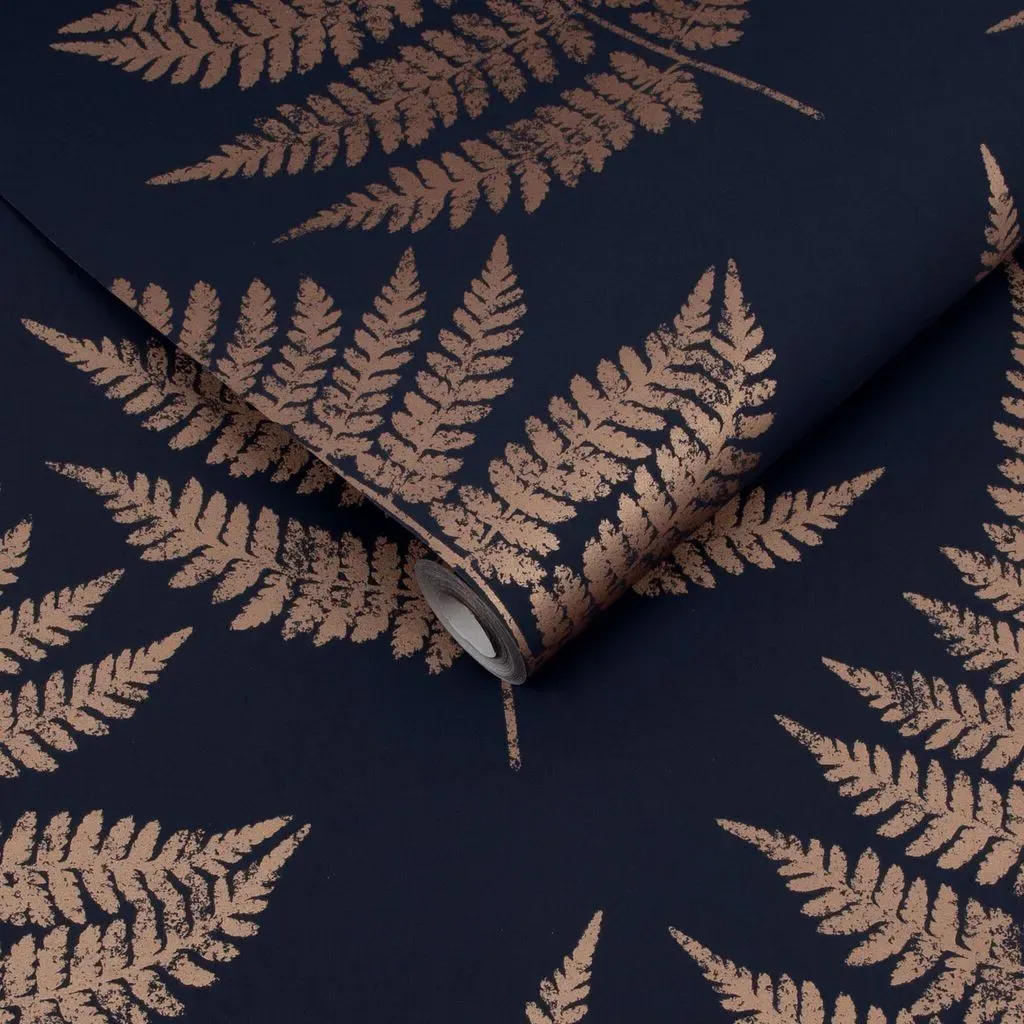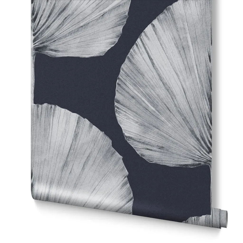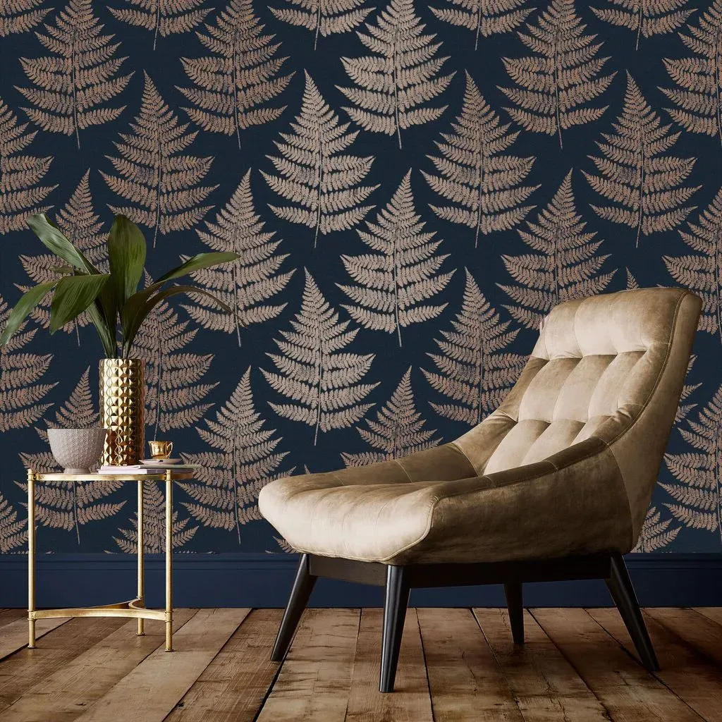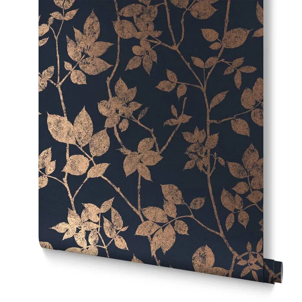 The Botanica Midnight wallpaper combines bold palette with sophisticated design through its simple leaf motif. Featuring a fading ombre metallic effect on stunning matt paper, this eco-friendly design offers effortless application. The metallic highlights add depth and visual interest against the blue backdrop.