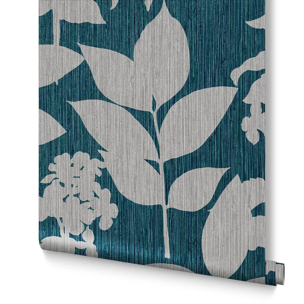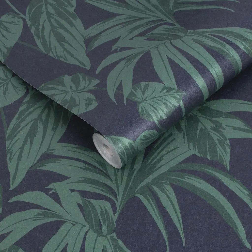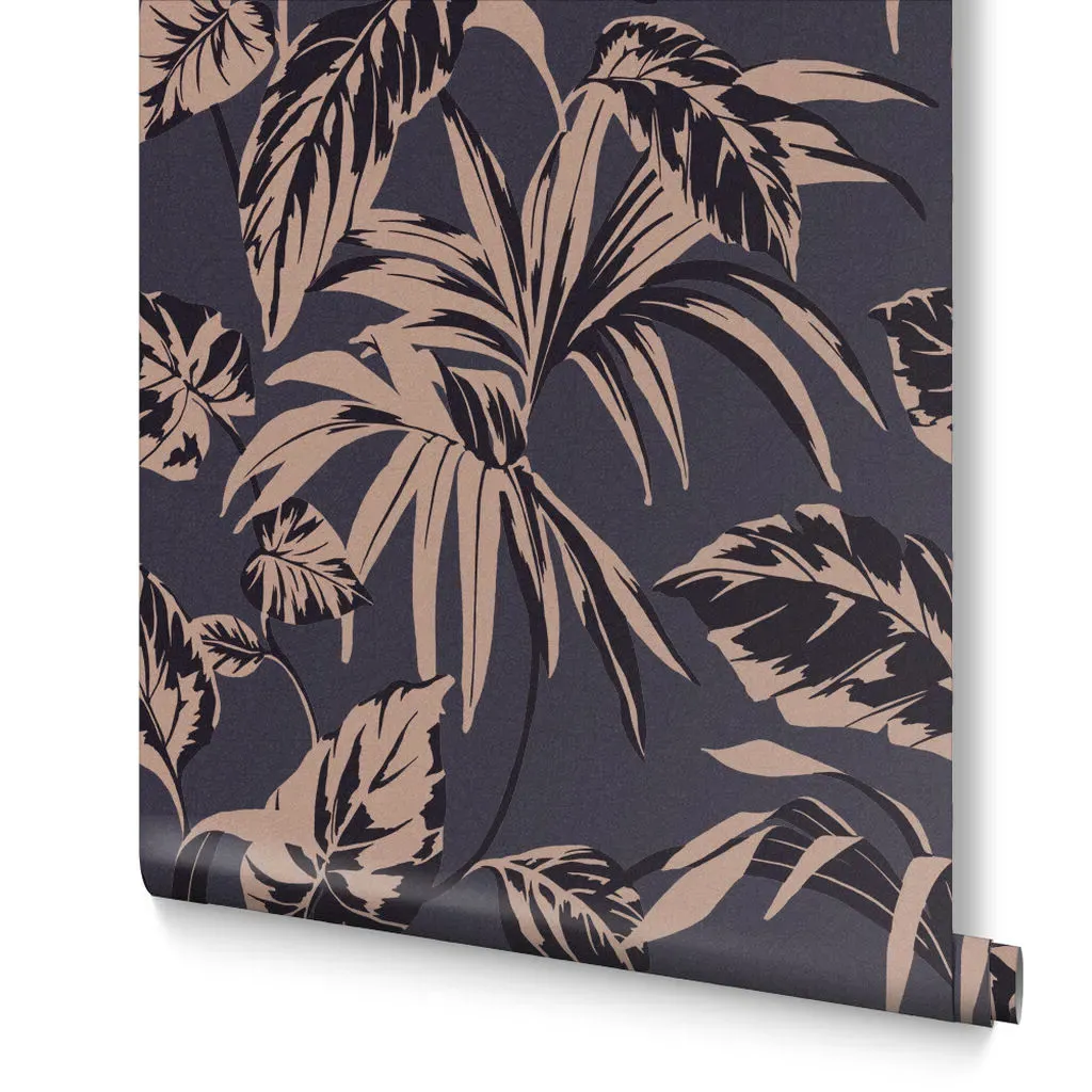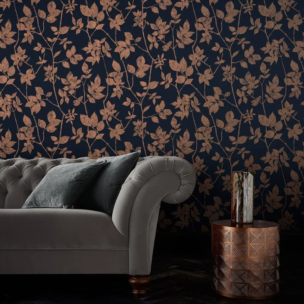 The Botanica Midnight wallpaper combines bold palette with sophisticated design through its simple leaf motif. Featuring a fading ombre metallic effect on stunning matt paper, this eco-friendly design offers effortless application. The metallic highlights add depth and visual interest against the blue backdrop.