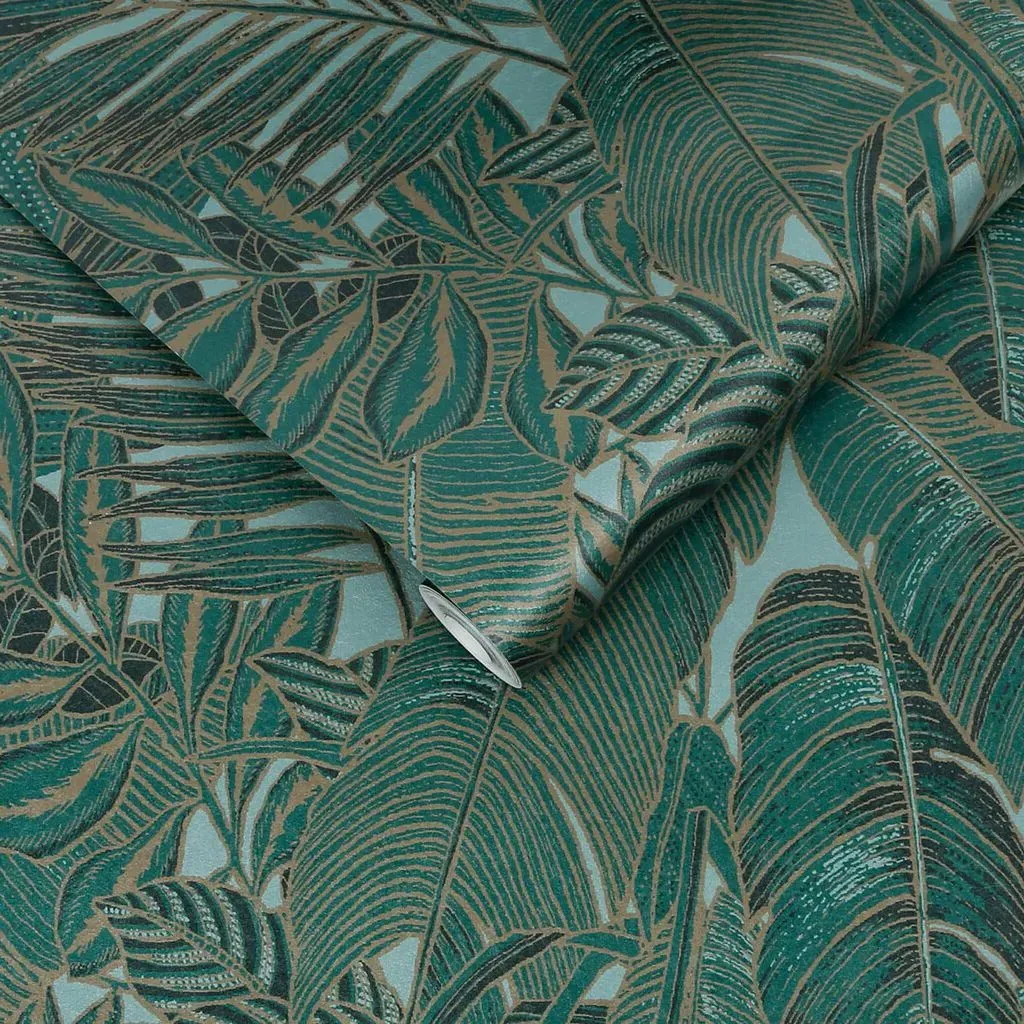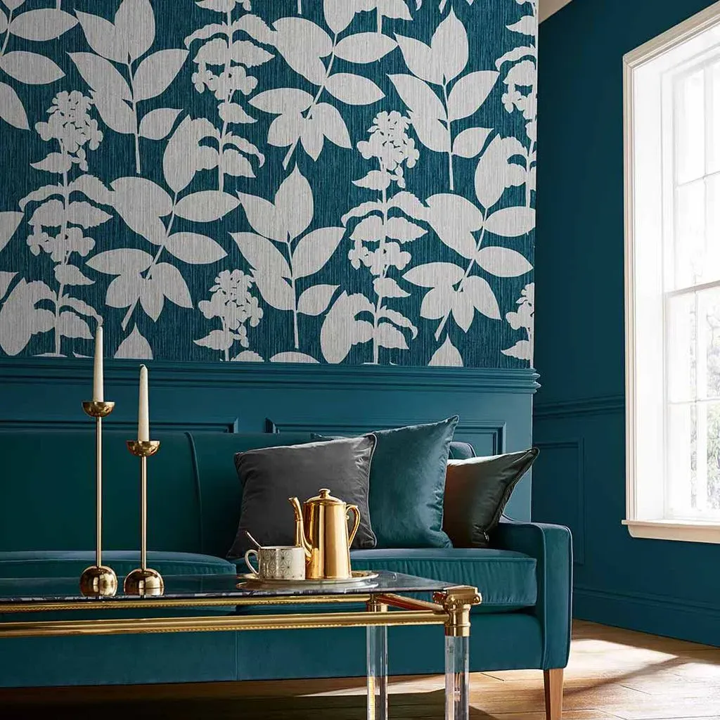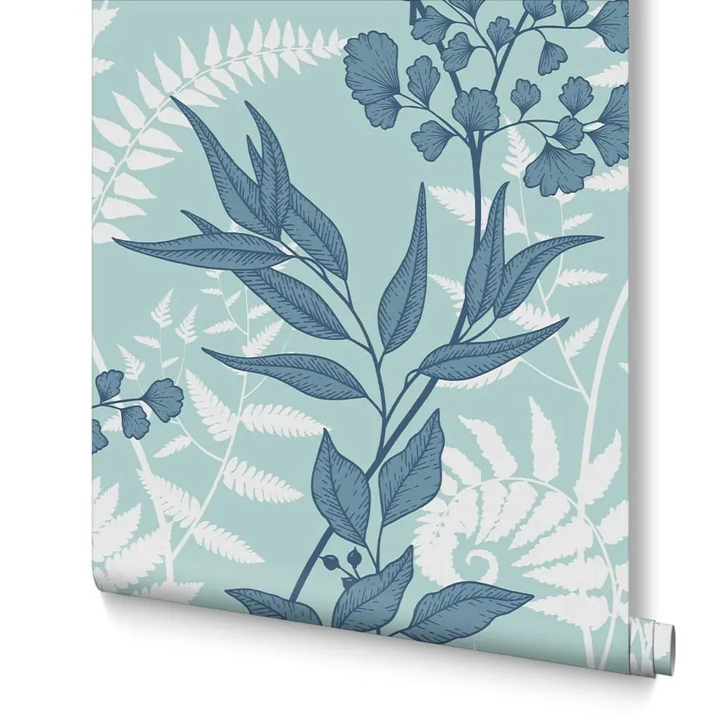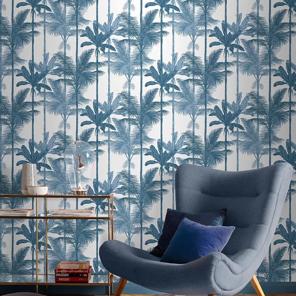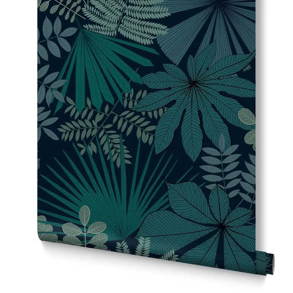 The Botanica Midnight wallpaper combines bold palette with sophisticated design through its simple leaf motif. Featuring a fading ombre metallic effect on stunning matt paper, this eco-friendly design offers effortless application. The metallic highlights add depth and visual interest against the blue backdrop.