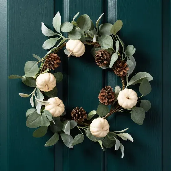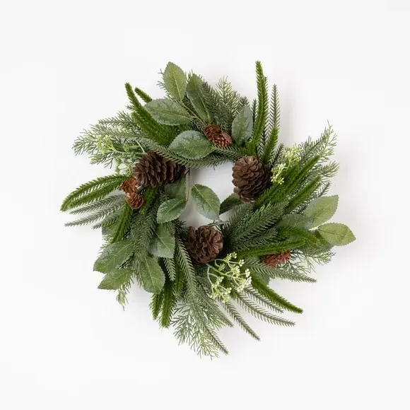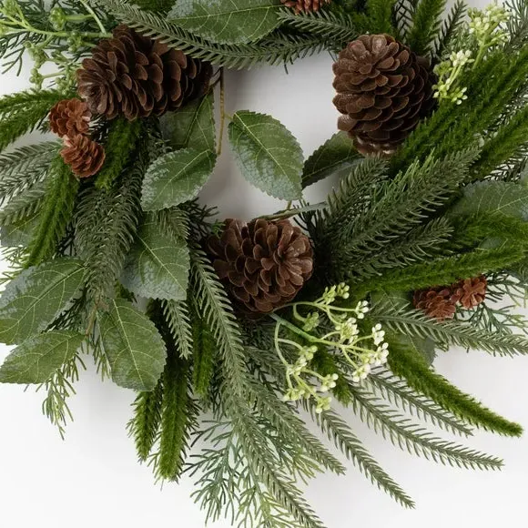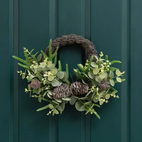 * 40cm artificial foliage wreath* Lush greenery and natural pinecones* Touch of woodland charm* Lifelike texture and tone* Wreath width: 40cm. Add a touch of woodland charm with this 40cm Artificial Pine, Eucalyptus & Pinecone Wreath. Lush greenery and natural pinecones combine to create a lifelike display full of texture and depth. Perfect for doors, walls or mantelpieces, it brings the beauty of the outdoors in - without the upkeep. A timeless piece for seasonal decorating or year-round rustic style. Wreath width: 40cm. Bring indoors during adverse weather conditions to preserve its look.