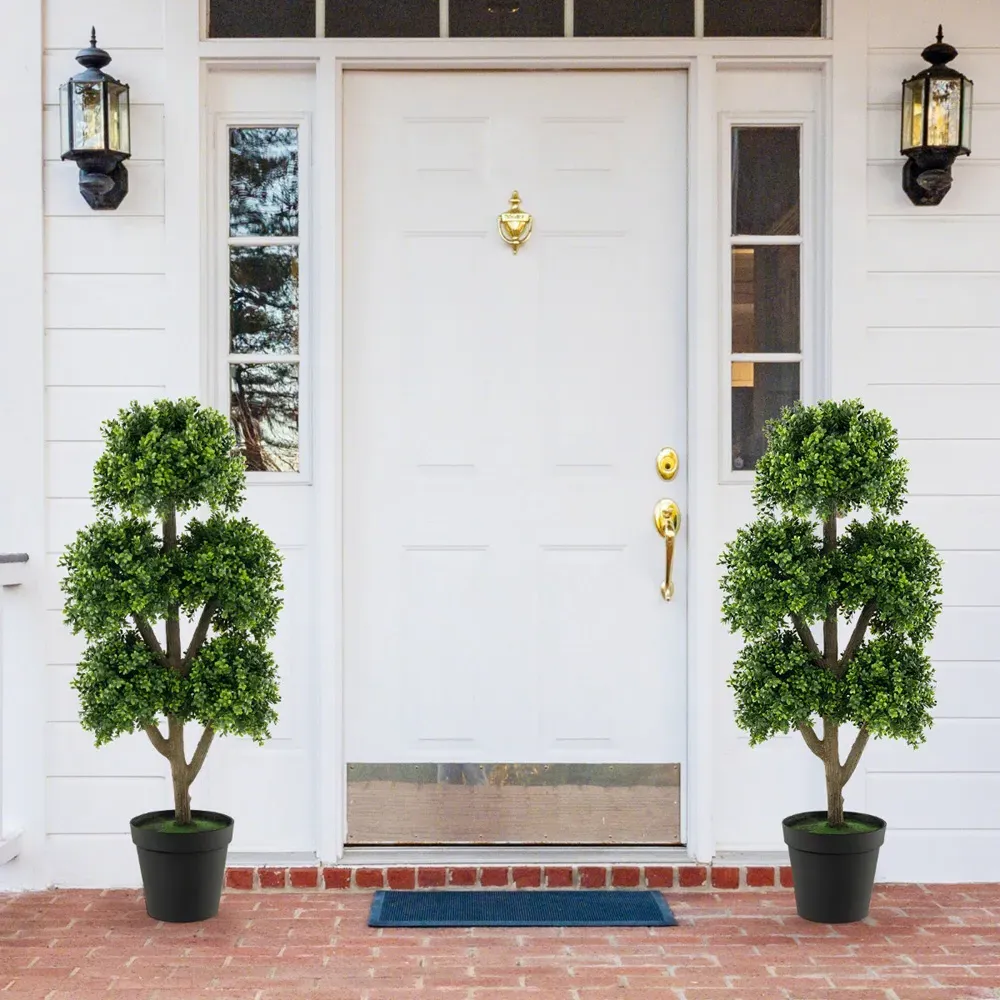 The artificial boxwood ball topiary tree features lush leaves with a simulated trunk and twisted PE vines for a vivid, lifelike appearance. Made from high-quality PE material, it provides odourless, allergy-proof construction with UV protection for long-lasting durability. The cement-filled pot ensures exceptional stability, making it suitable for both indoor and outdoor placement.