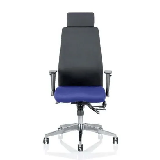 The Onyx chair is a fresh, contemporary office chair that offers a range of inspired features such as a multi-functional asynchronous mechanism with multiple adjustments and a contoured foam seat and back for extra support and comfort. The Onyx is a top choice for a posture task chair. Available in black or blue fabric and bonded leather upholstery options. Optional headrest variant available. FEATURES : Material : Leather Finish : Black Seat slide Contoured foam Ratchet back height adjustment Adjustable arms 3 lever mechanism Pump up lumber Brushed aluminium base UK crib 5 foam and fabric Gas lift tested up to 135kg Usage: Task 24/7 Most Stylish and Unique piece of furniture Matching furniture available Images shown are for illustration purpose only Available at an affordable price Dimensions: Seat Width : 450mm Seat Depth : 470-540mm Seat Height : 490-590mm Back Width : 430mm Back Height : 670-850mm Arm Width : 445mm Arm Height : 660-760mm Overall Width : 610mm Overall Depth : 670mm Overall Height : 1210mm