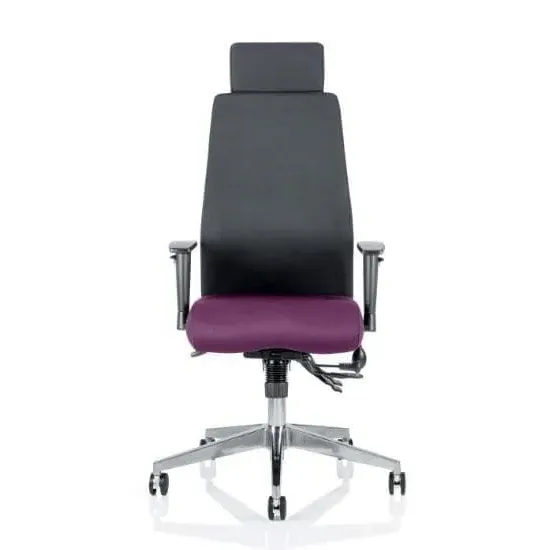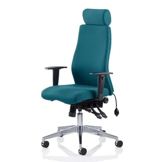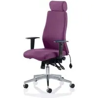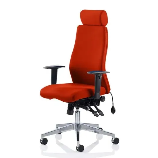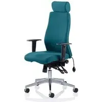 The Onyx office chair combines ergonomic support with professional functionality through its multi-functional asynchronous mechanism and contoured foam construction. Its adjustable features include seat slide, ratchet back height adjustment, and pump-up lumbar support, while the brushed aluminium base provides stability for 24/7 task usage. The chair accommodates users up to 135kg with its tested gas lift system and UK Crib 5 certified materials. W61 x D67 x H121 cm.